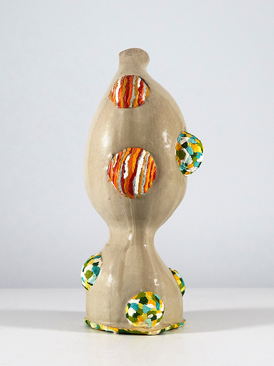 Ceramic sculpture of a container with glaze and encaustic pigments.