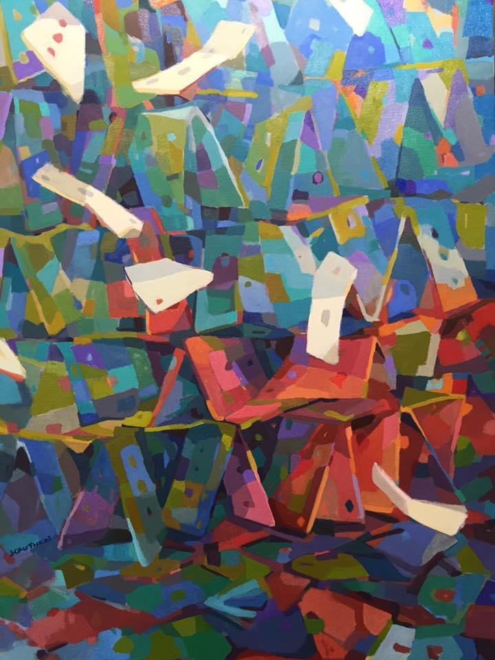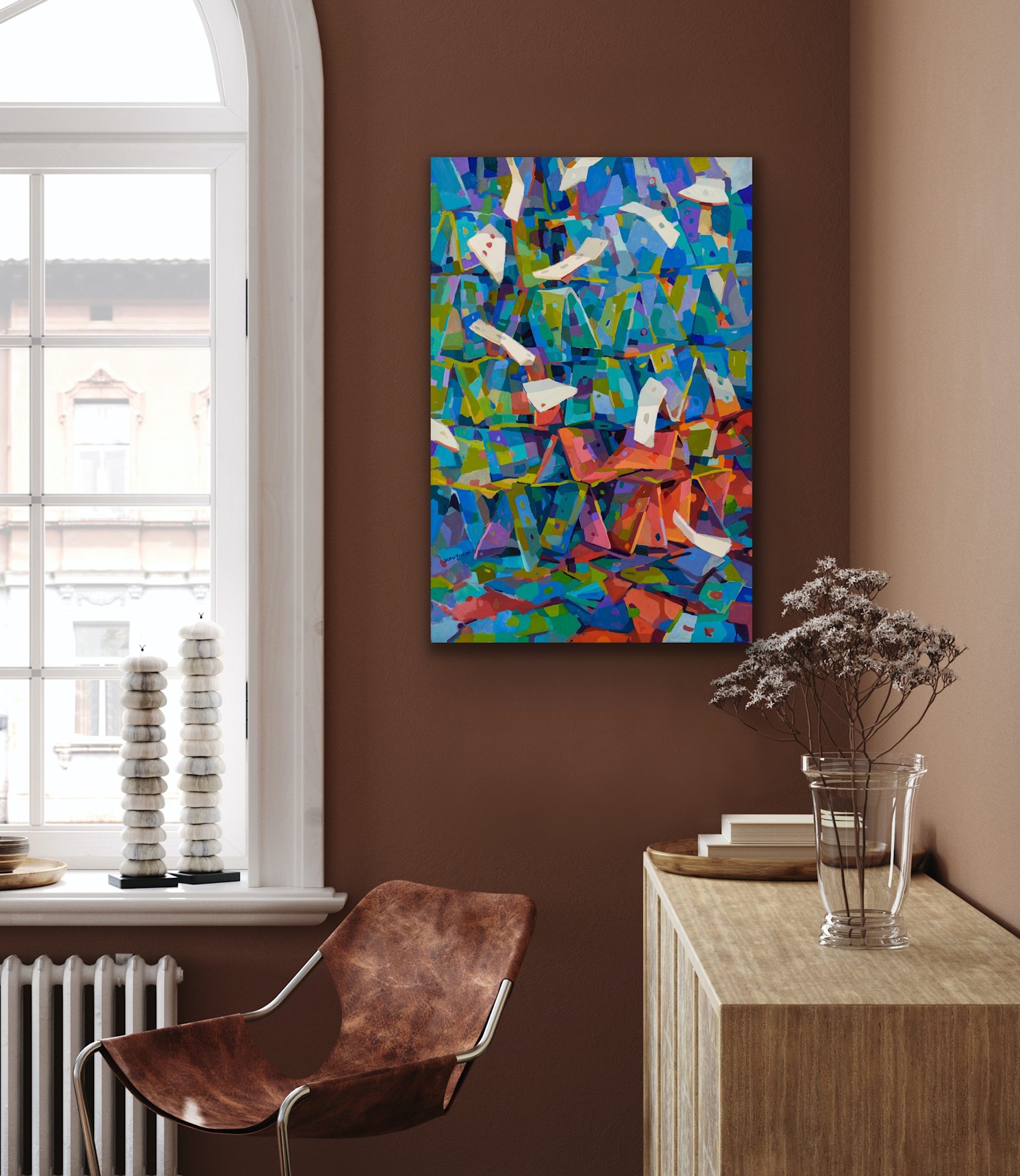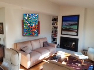 Lower portion of painting is not as dark as it appears in photograph. This work is framed in a simple dark-stained floating frame. Buyer may want to have replaced.