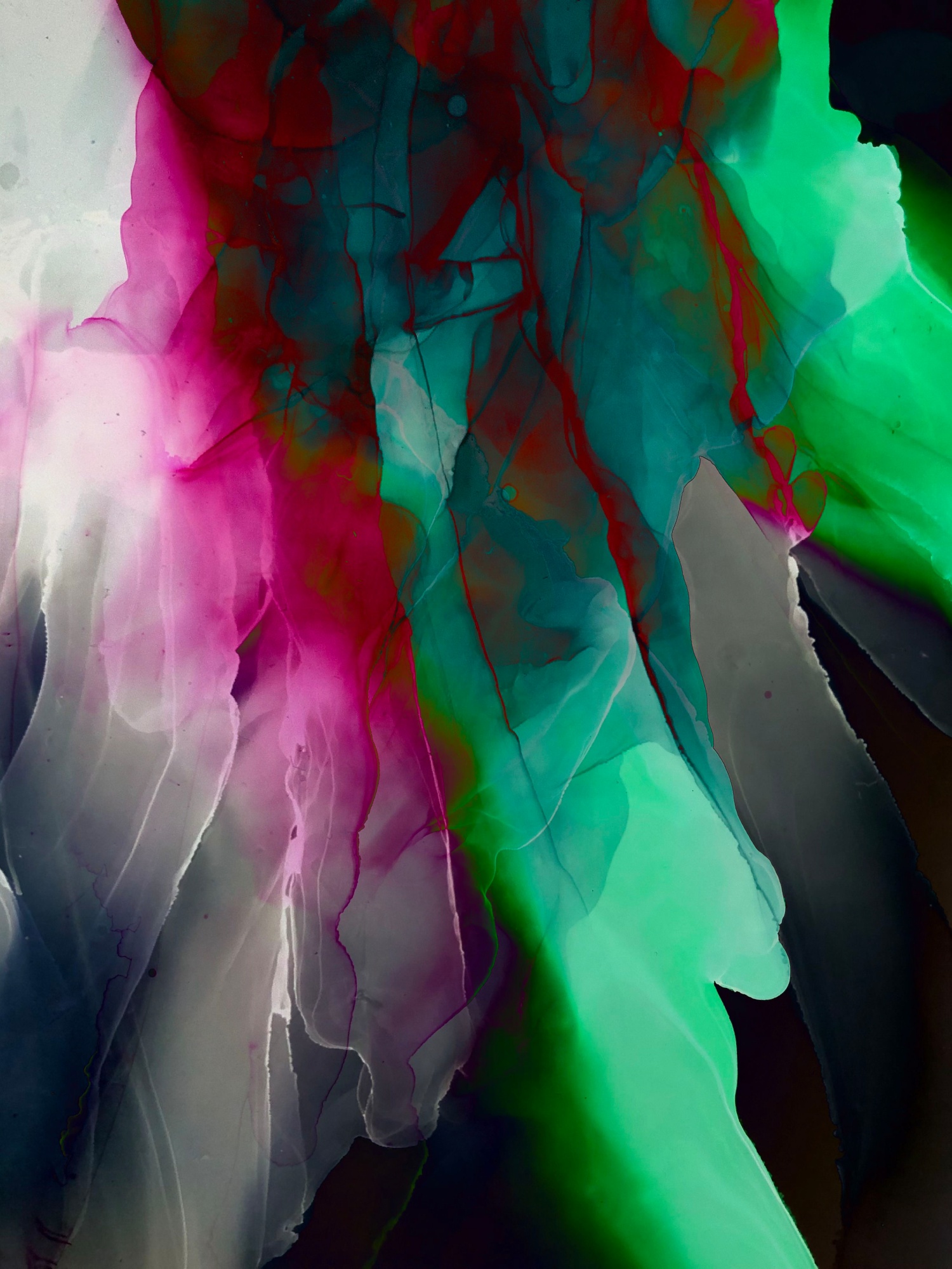 The serie Alchemy artworks are a combination of traditional painting and digital work with ink, mixed media and resin on a wood panel.