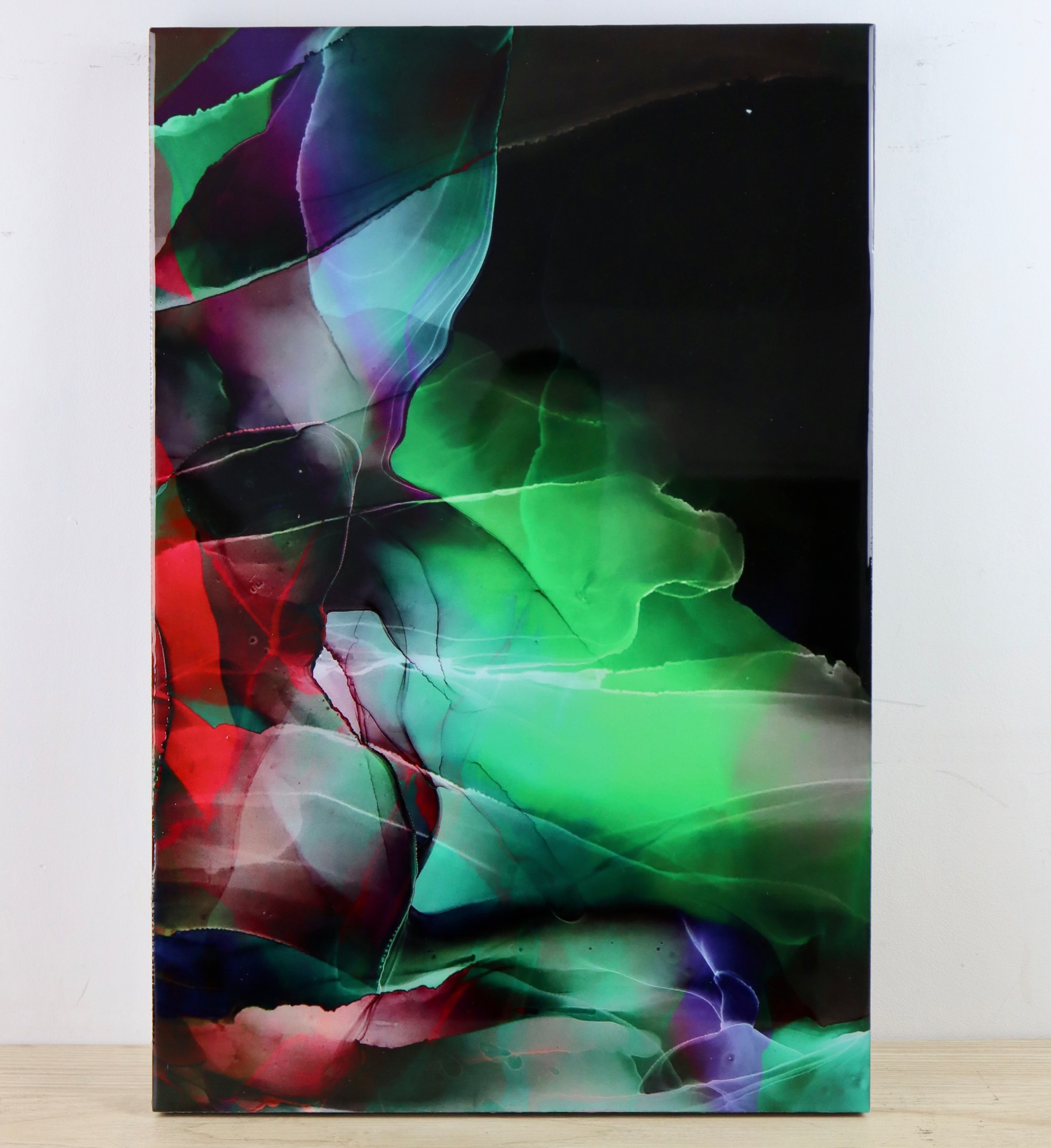 Mixed medium on black birchwood, acrylic glass/ resin.