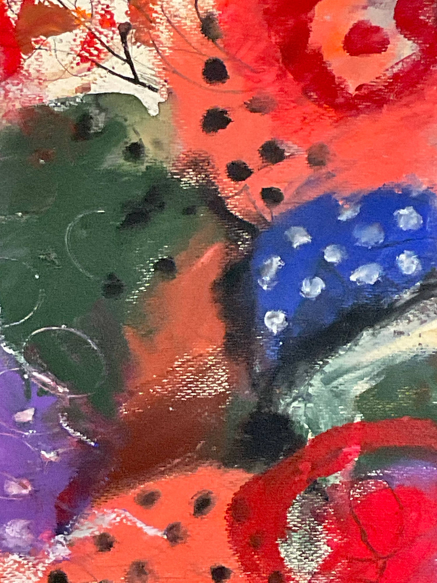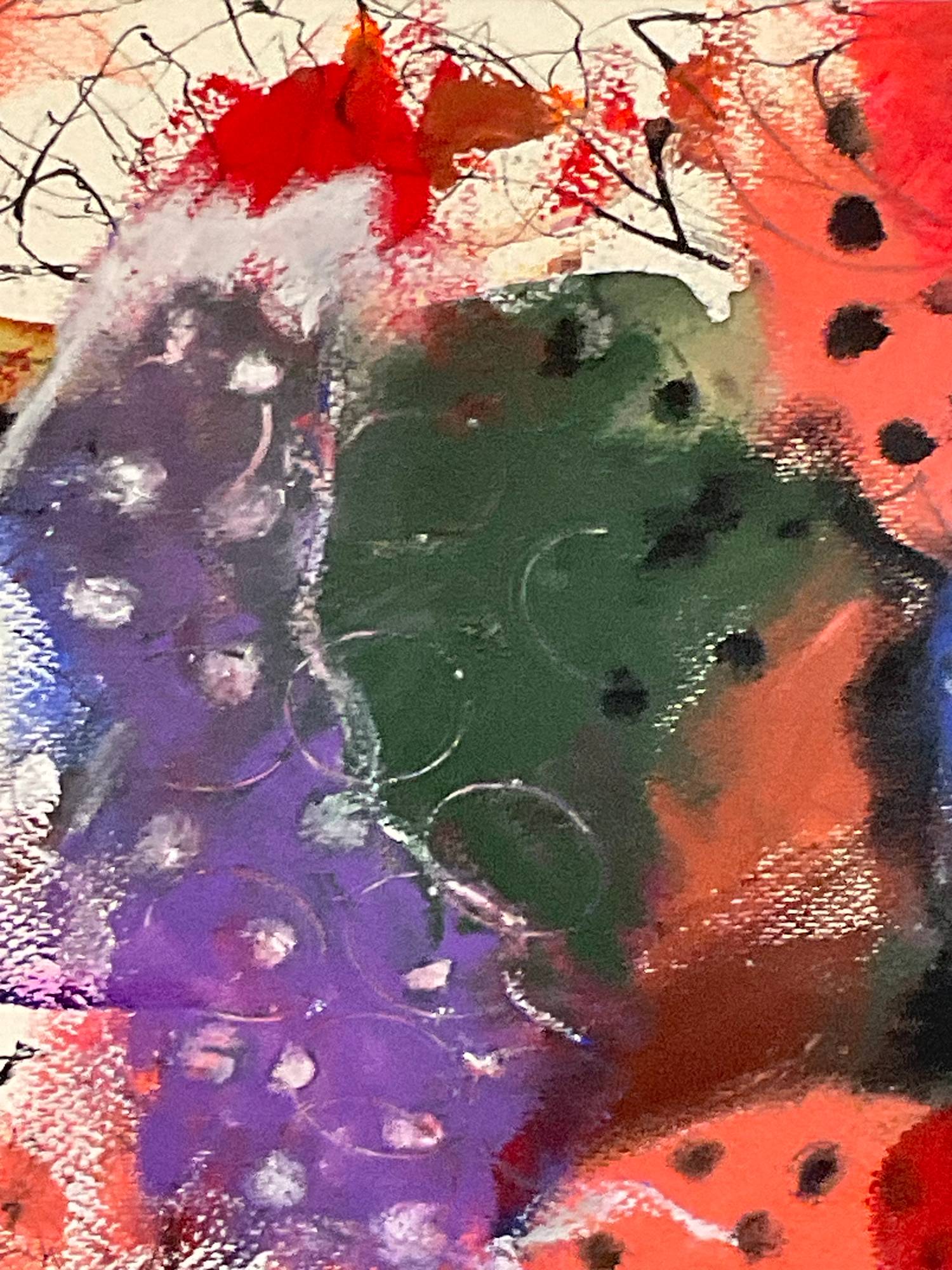 Abstract Symphony unfolds like a visual composition, where bold passages of crimson, violet, and emerald green resonate in harmony with softer layers of white and deep indigo. Spontaneous markings—dots, scribbles, and etched lines—play across the surface like musical notes, creating a rhythm that feels both improvisational and deliberate.