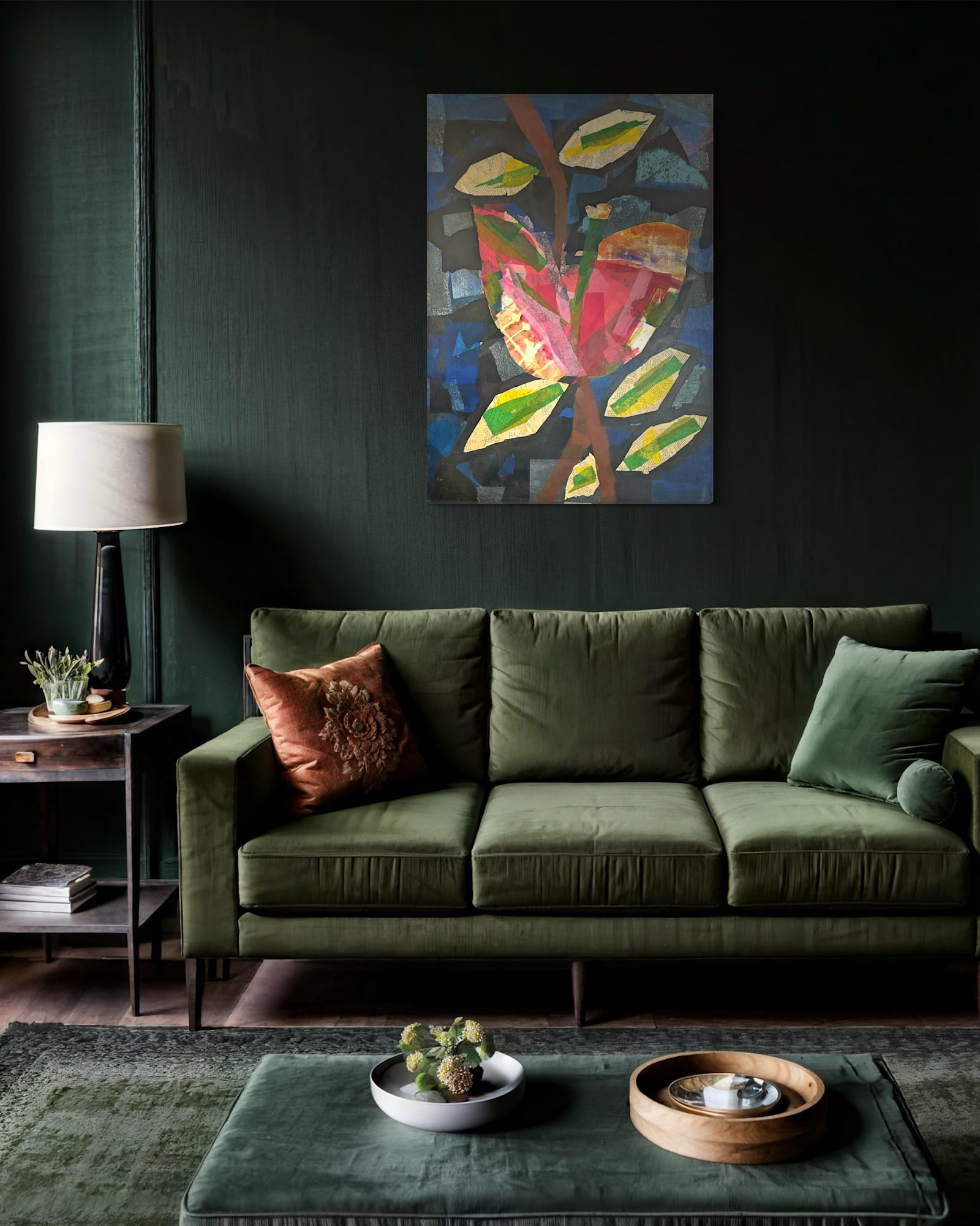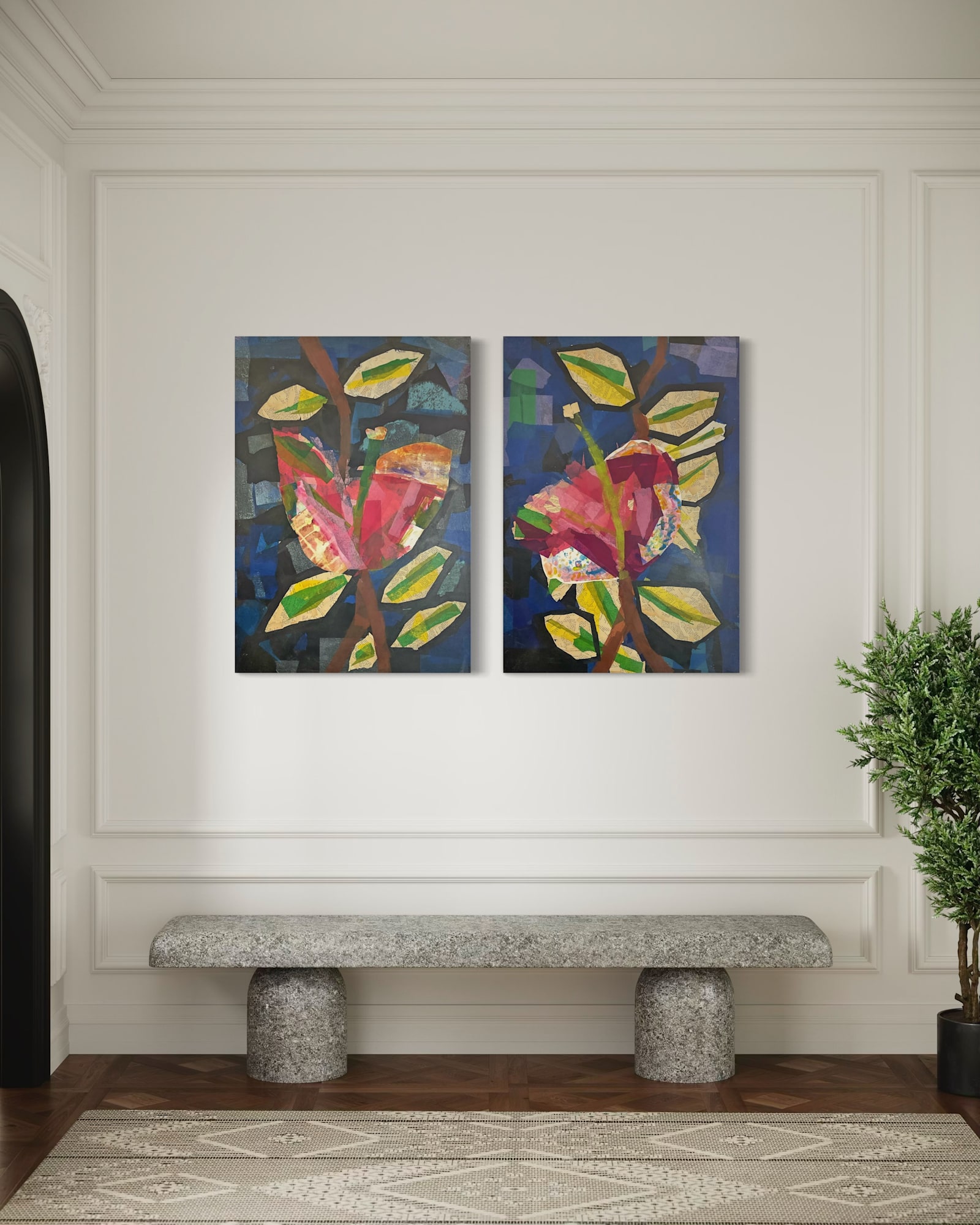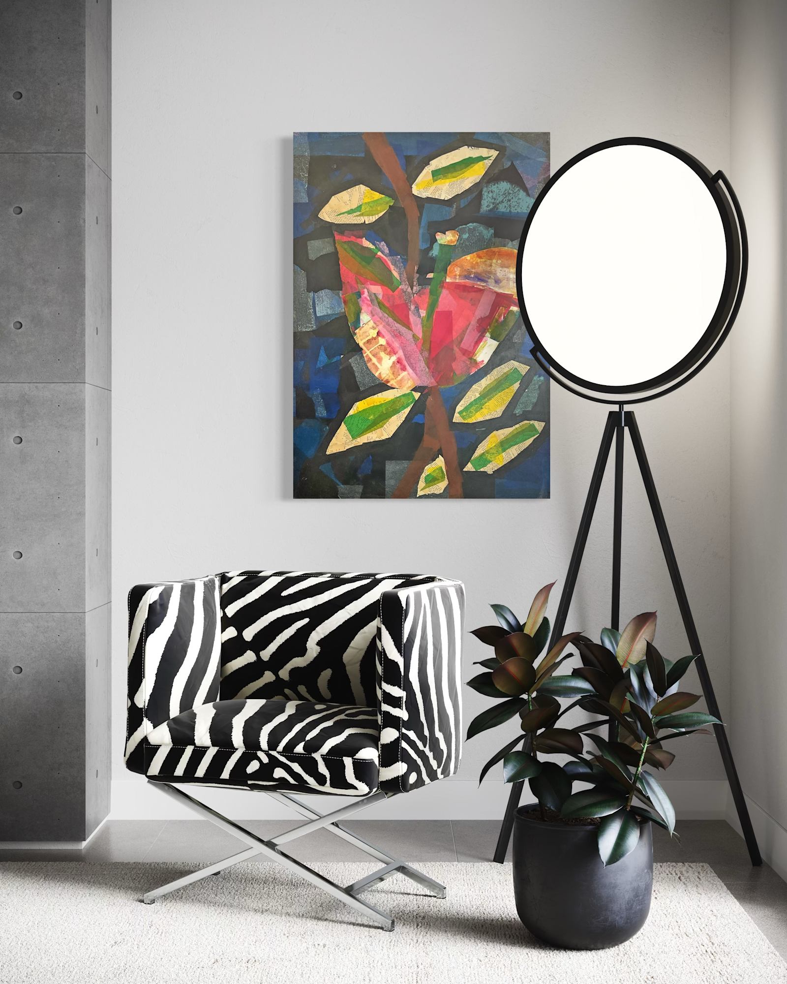 This mixed media paper collage by Jeanne M. Connolly features a single Spanish Bougainvillea flower blooming vibrantly against a black and blue mosaic-style background. Constructed from a mix of delicate papers layered with hand-painted fragments, the piece evokes the fluidity of watercolor while offering rich texture and tactile dimension.