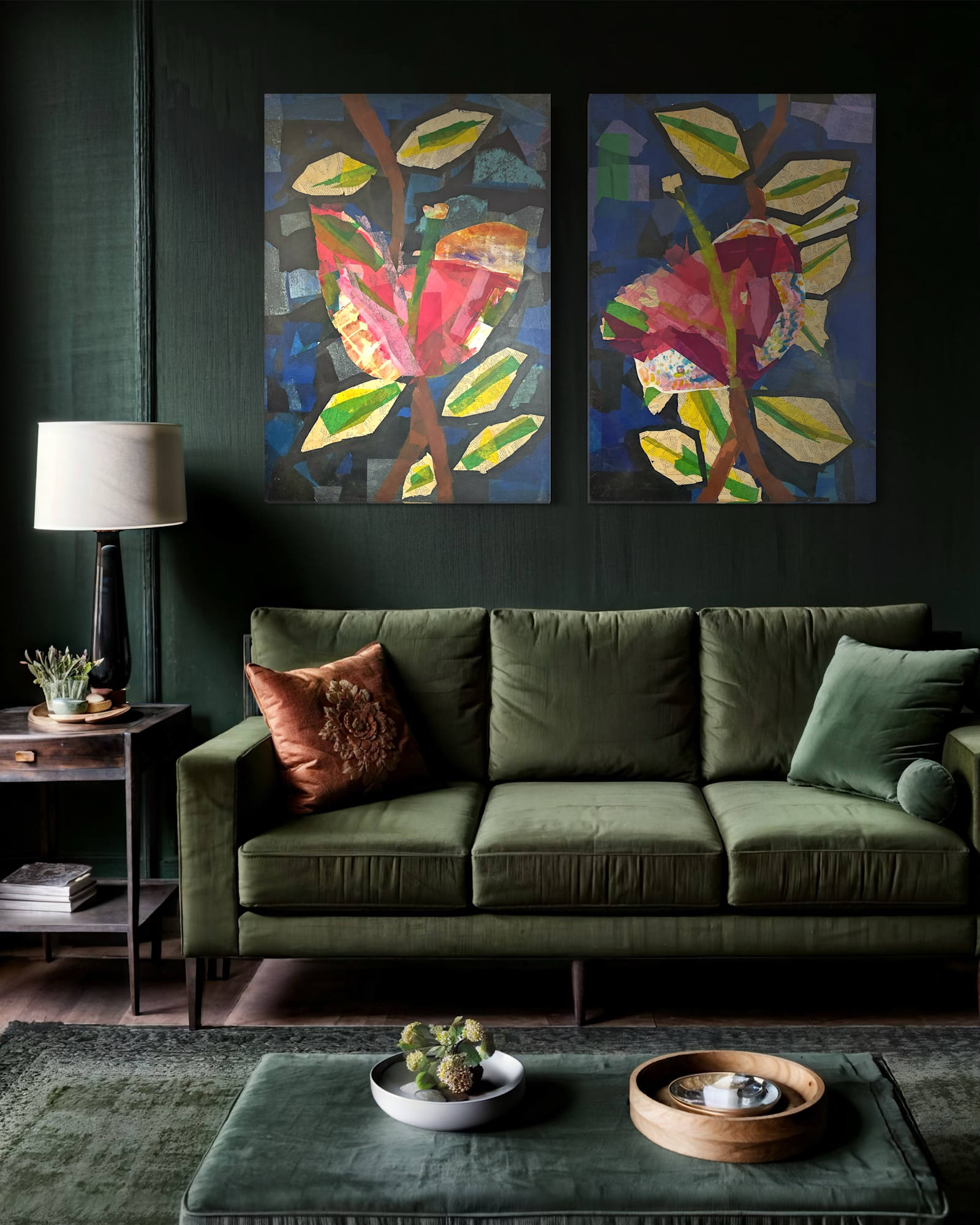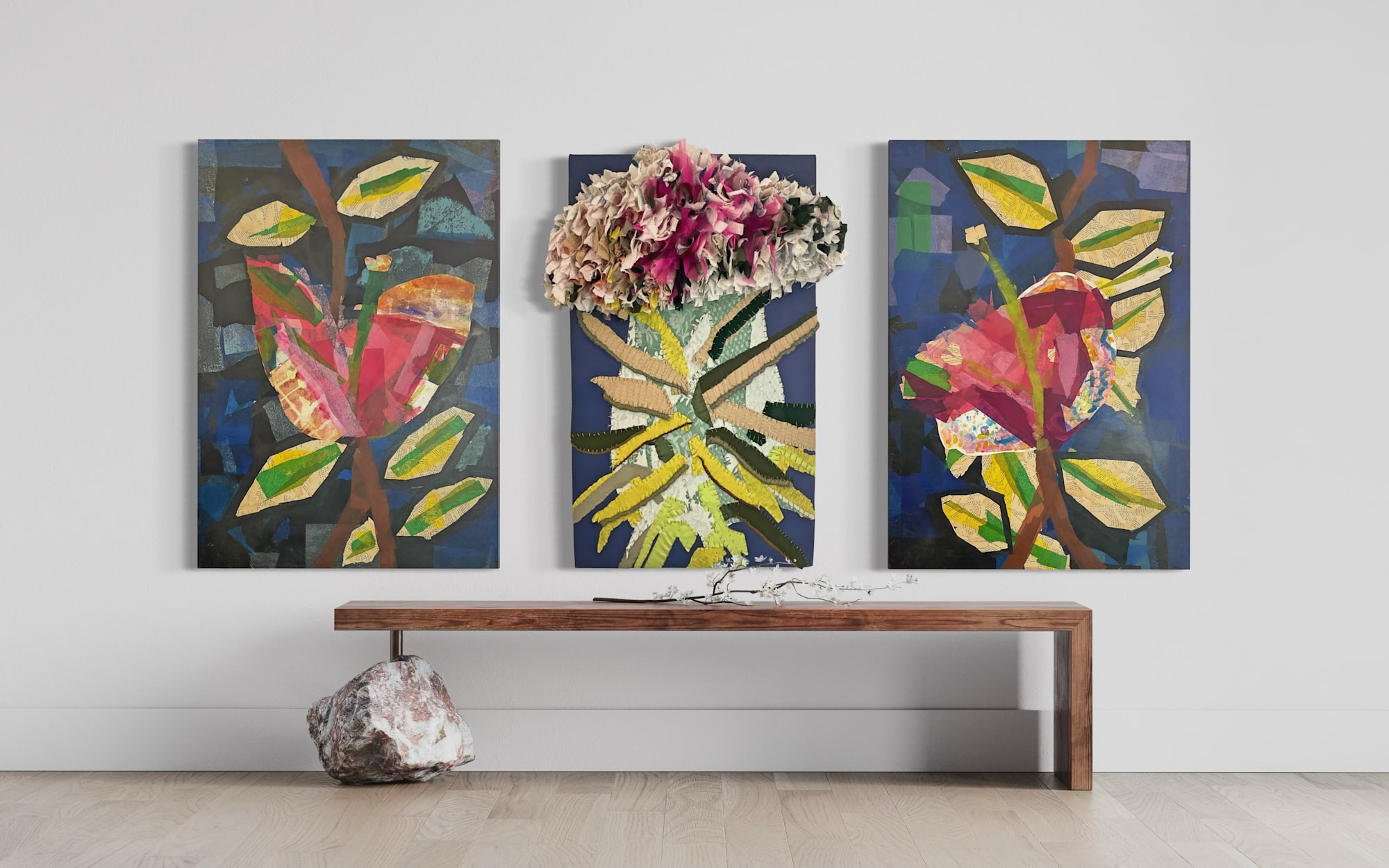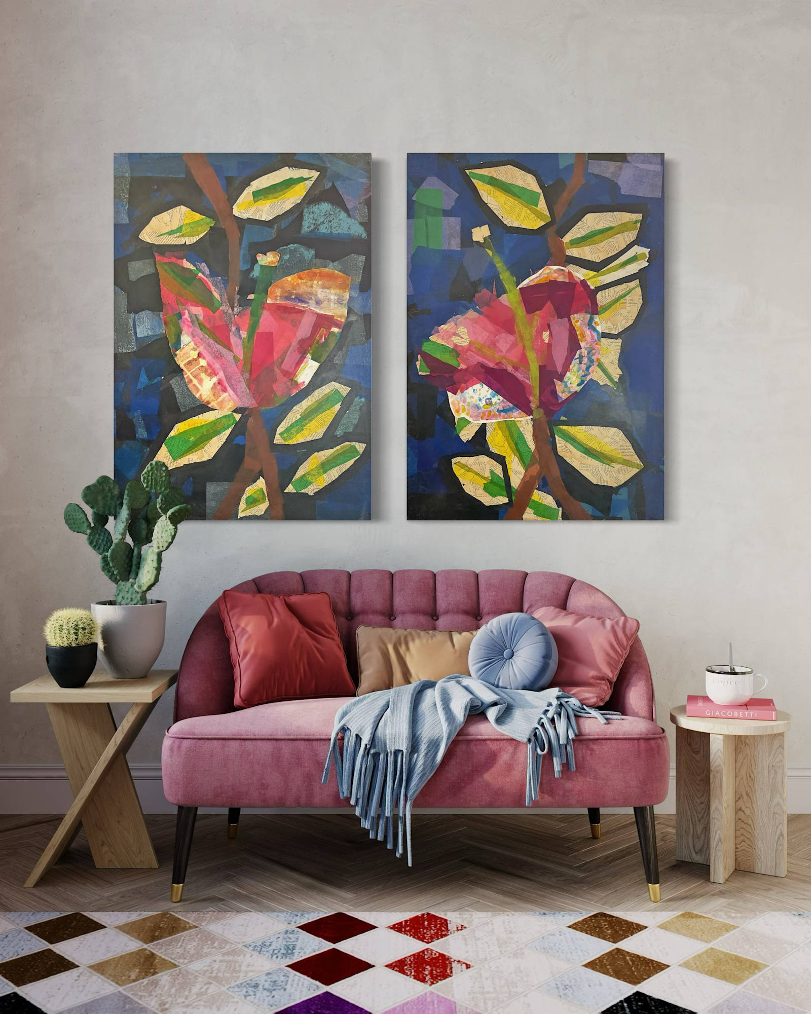 This mixed media paper collage by Jeanne M. Connolly features a single Spanish Bougainvillea flower blooming vibrantly against a black and blue mosaic-style background. Constructed from a mix of delicate papers layered with hand-painted fragments, the piece evokes the fluidity of watercolor while offering rich texture and tactile dimension.