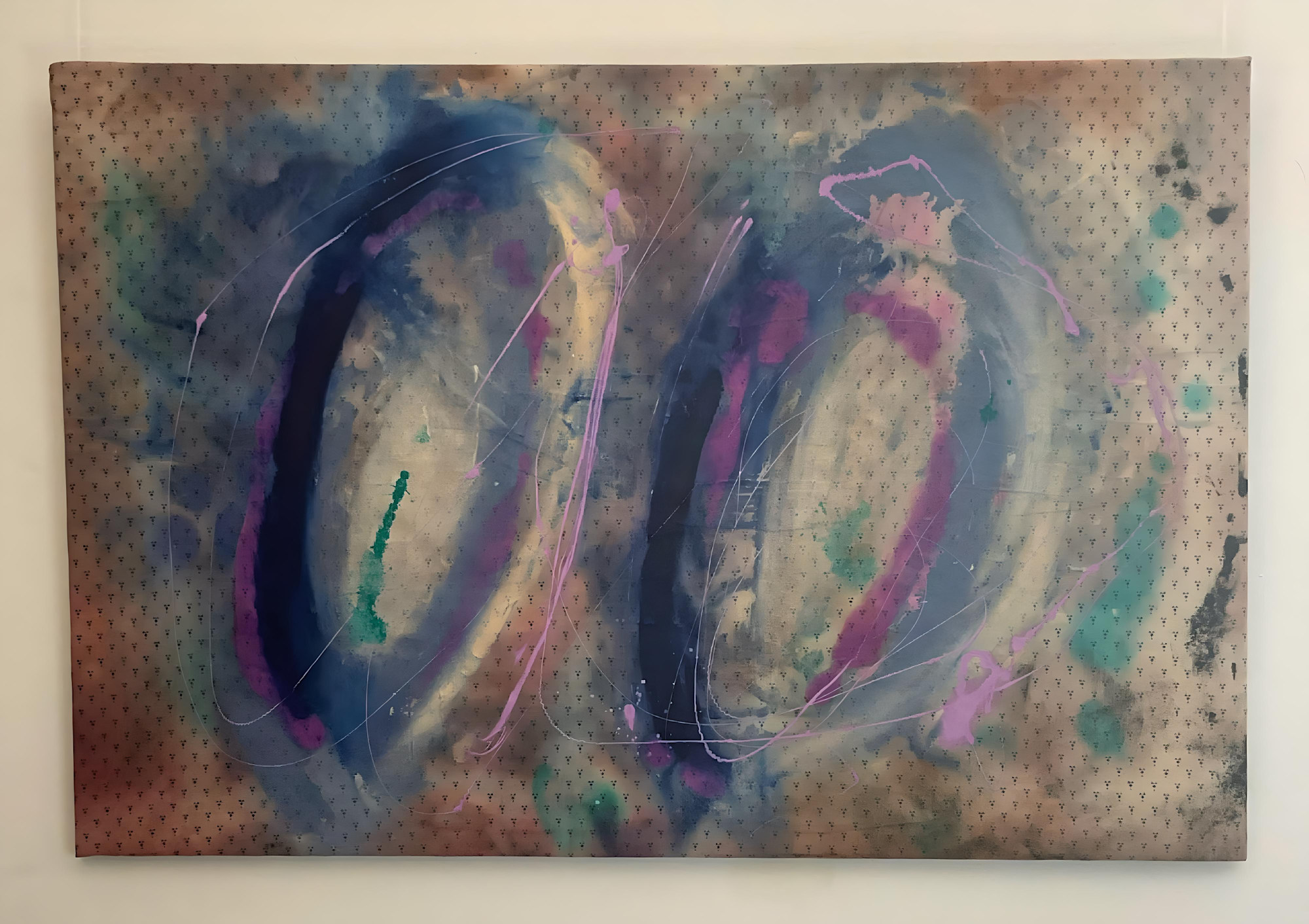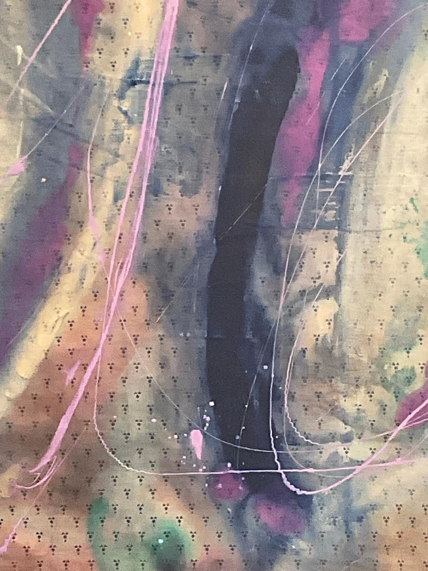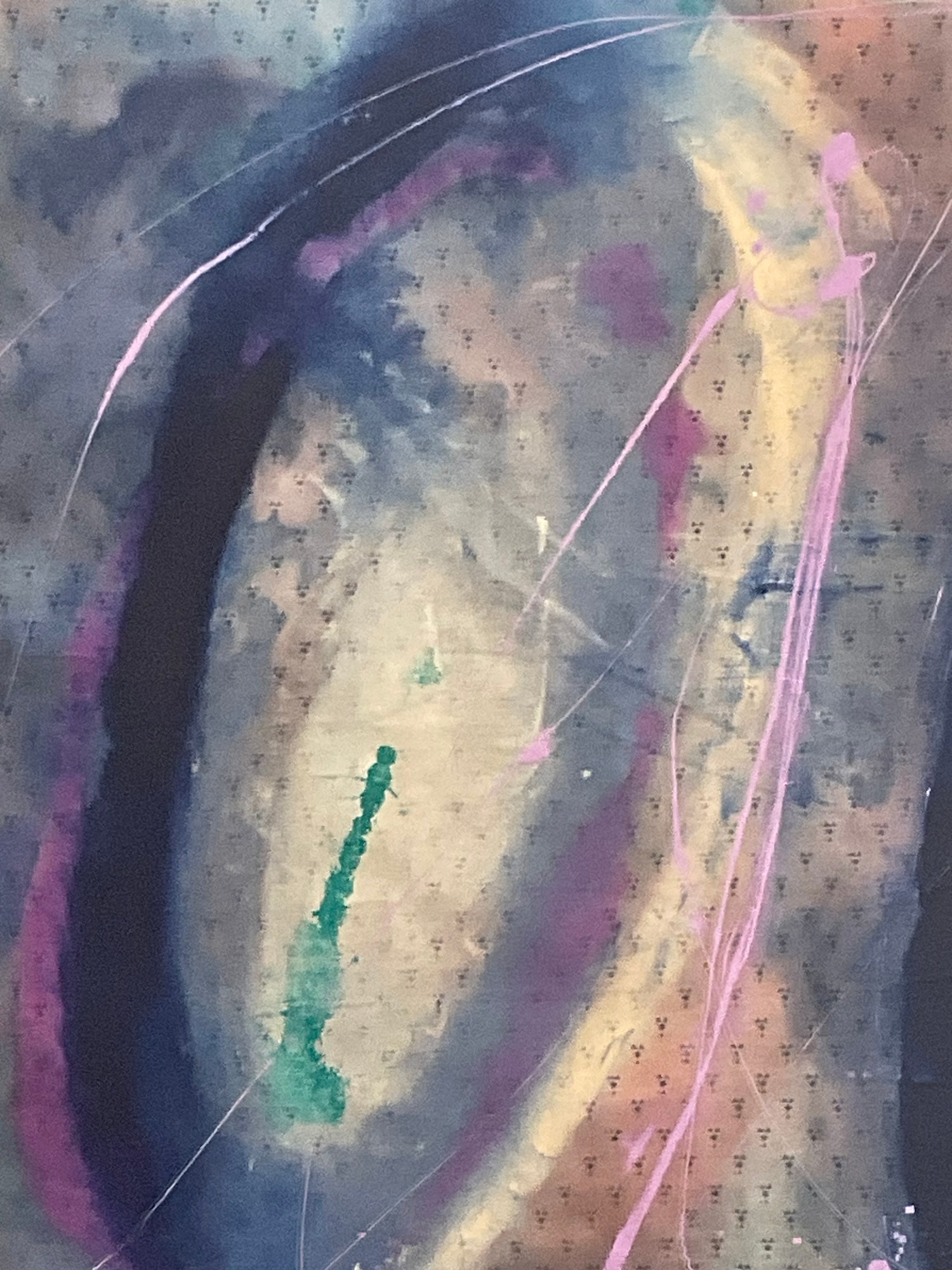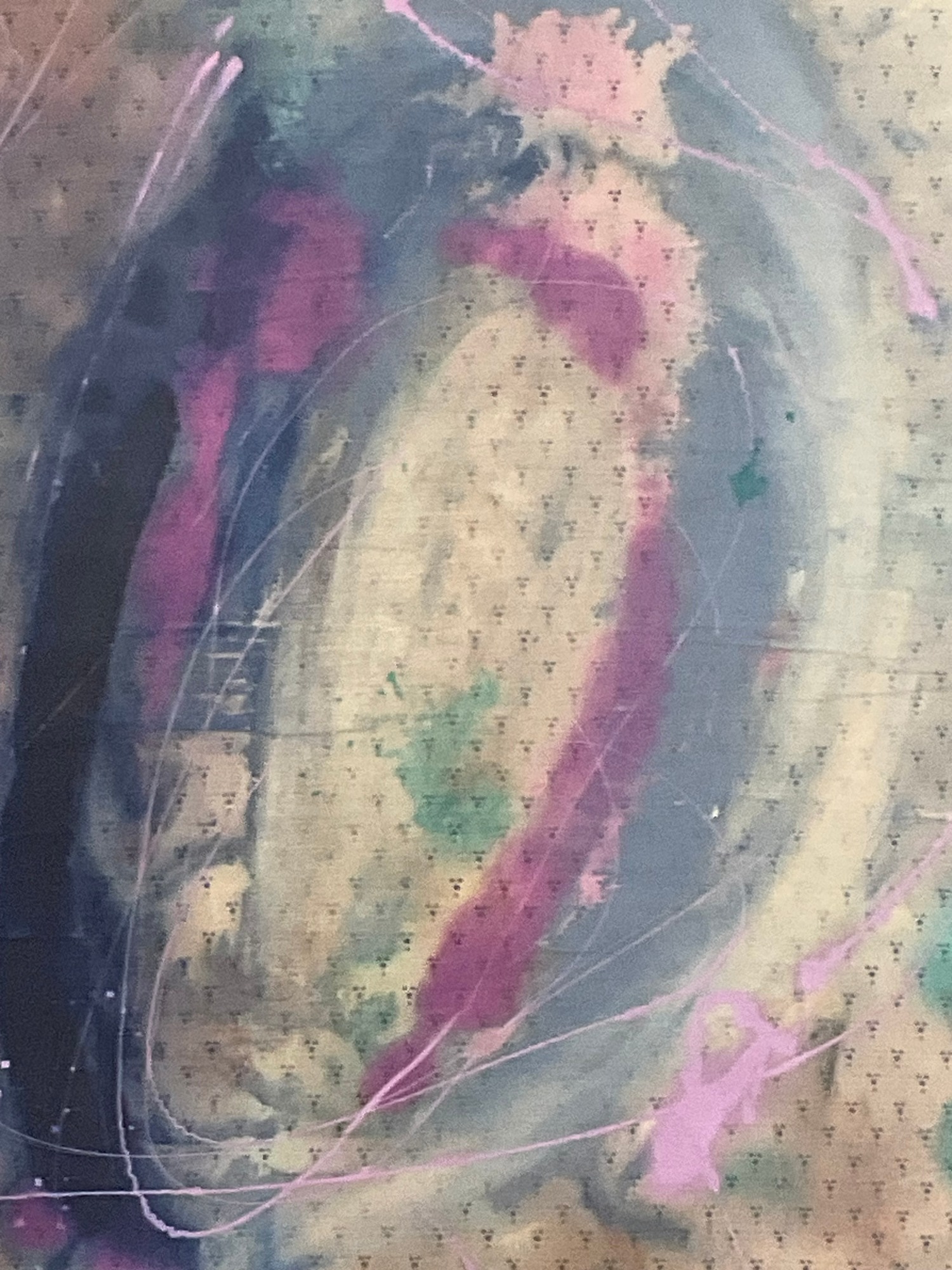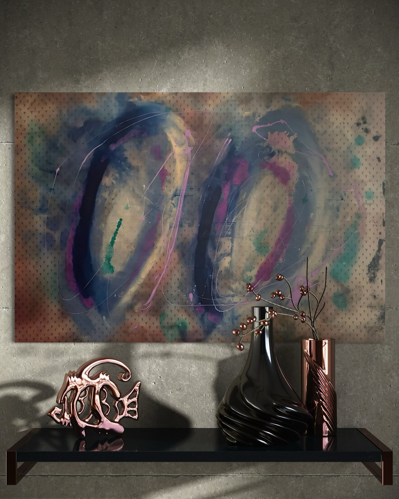 The largest piece in the Abstract Circles in Motion collection, Celestial Twins is a powerful expression of fluidity and organic movement. Created entirely without a brush, this artwork captures the energy of hand-painted circular motions, allowing the pigments to merge and flow naturally across the repurposed Laura Ashley fabric, where the original textile pattern subtly emerges, adding depth and texture.
