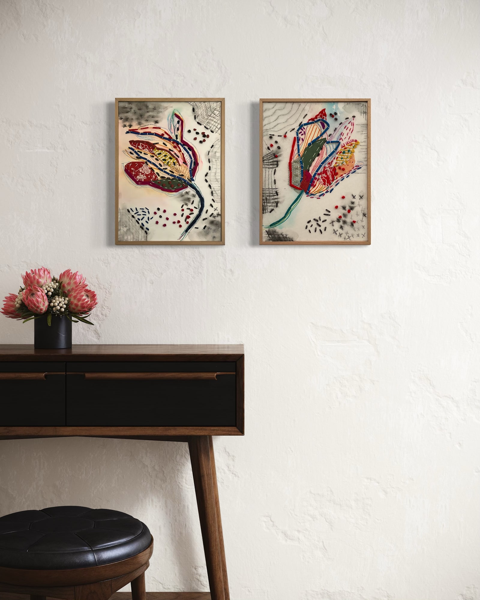Connolly brings the tulip to life with an intricate blend of vintage and recycled fabrics. Each petal is meticulously crafted and embroidered to create a lifelike representation. This careful selection of fabrics adds texture and depth to the artwork. The use of recycled materials also gives the piece a sense of history and sustainability. The Spanish Tulip stands elegantly against a backdrop of ink, graphite, and watercolor crayon. These mediums evoke the watercolor hues of dawn, enhancing the serene ambiance of the morning light. The artwork is framed in a natural wood frame, complementing its organic, nature-inspired theme.