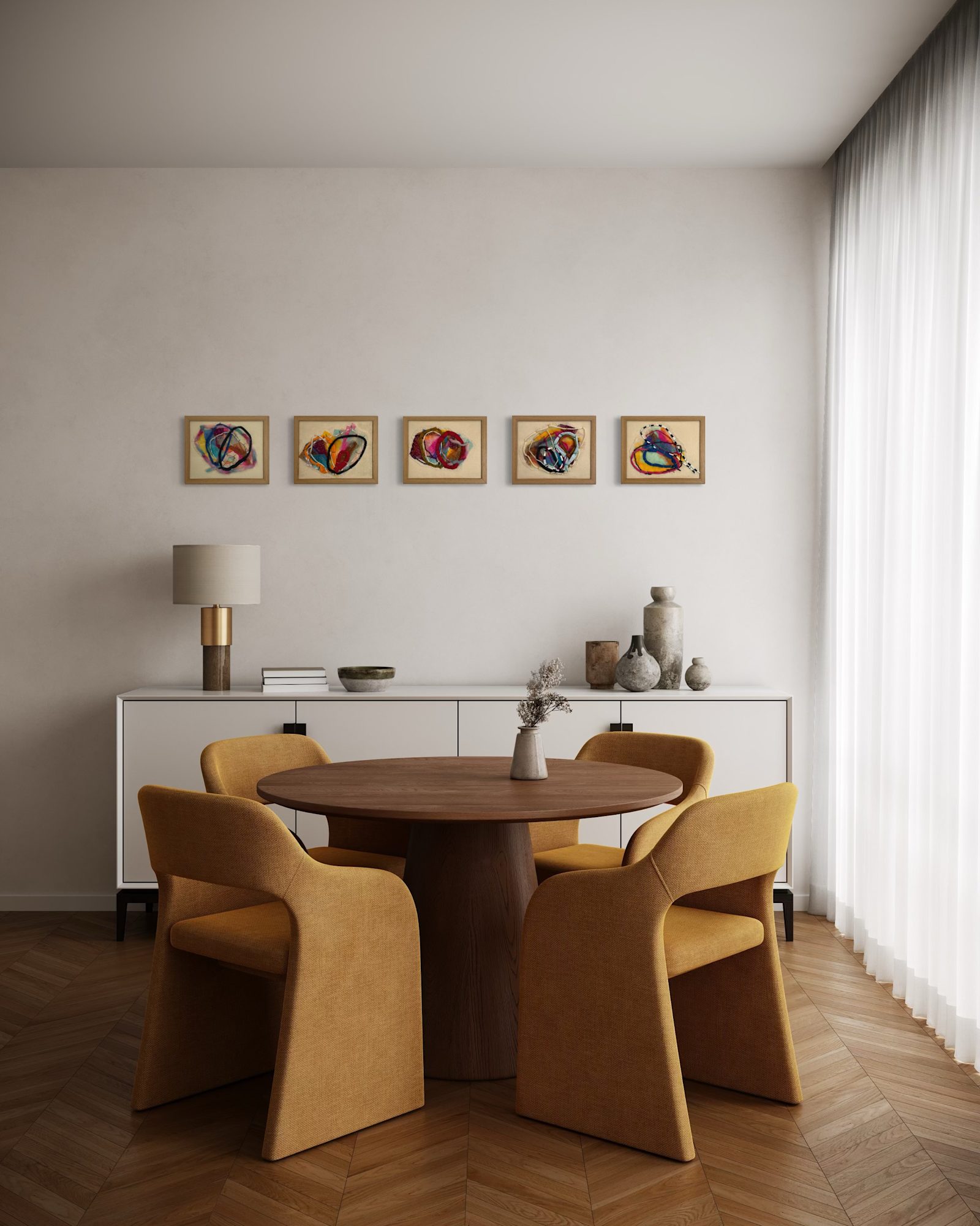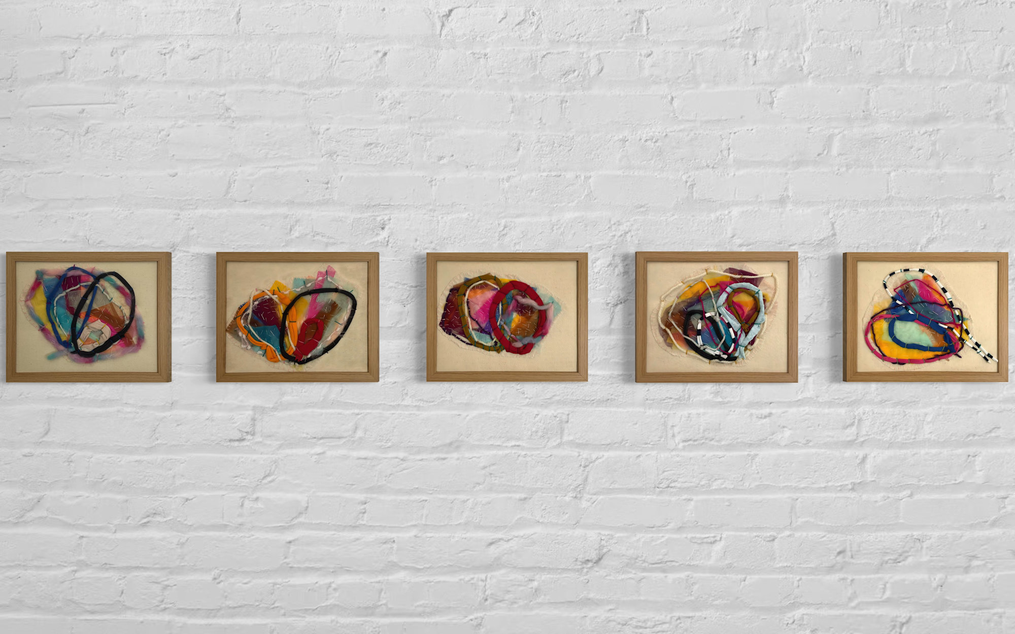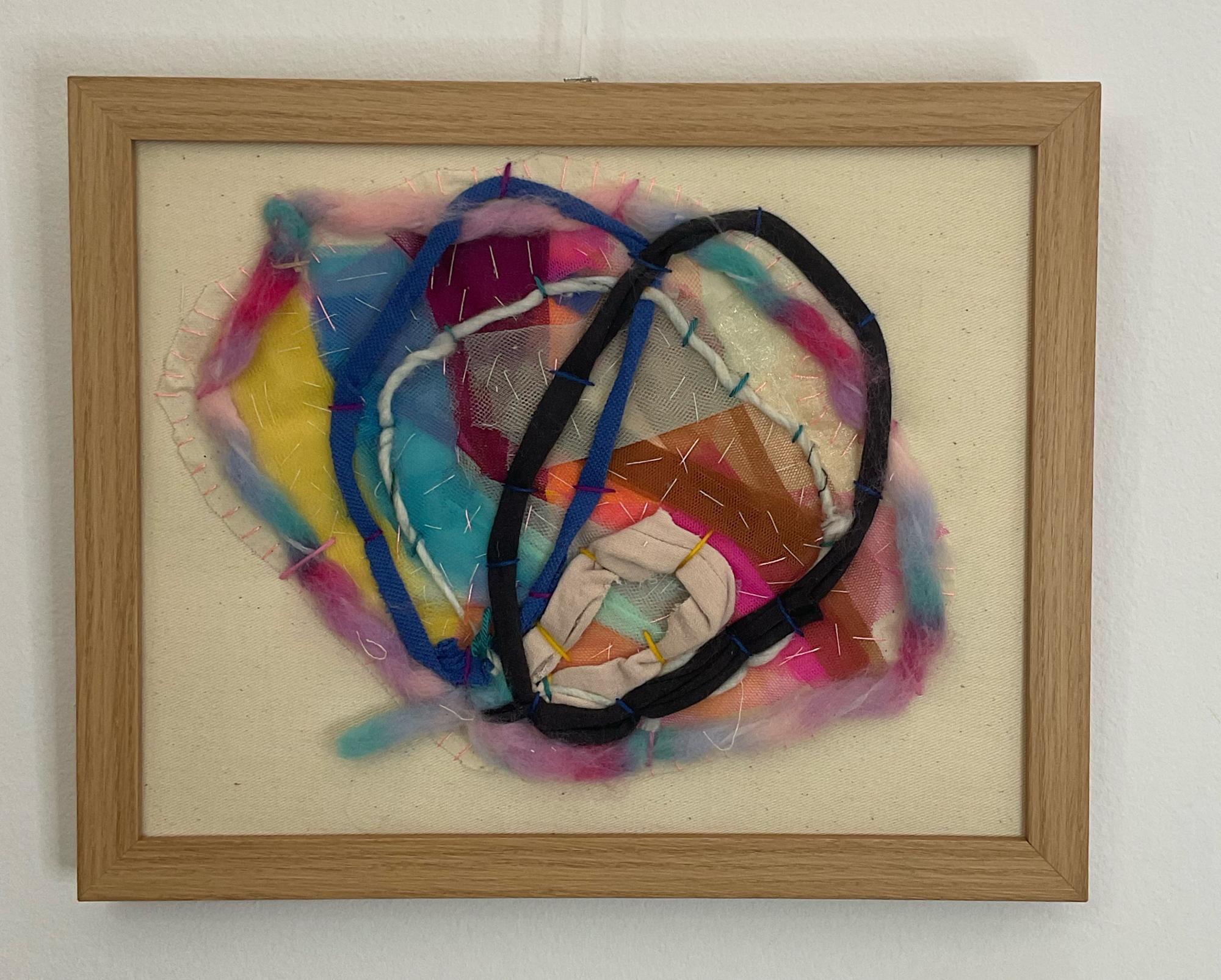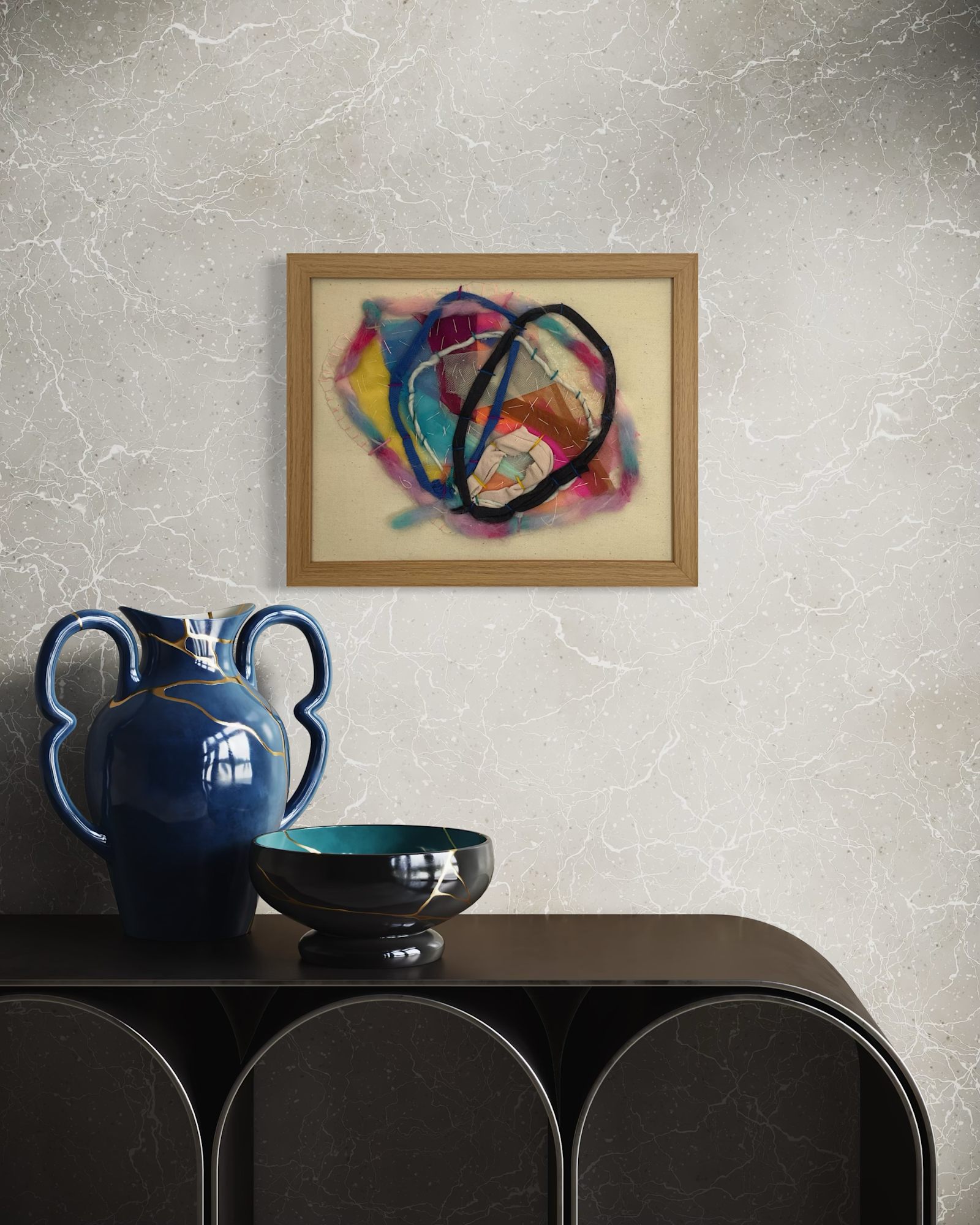 Echoes Beneath conjures the quiet poetry of life under the sea through a dynamic layering of tulle, wool fibers, and hand-stitched threads. Taking abstract cues from oyster shells, the piece features soft bursts of pastel pink, sky blue, and canary yellow held together by looping couching lines in black, teal, and ivory. The composition reveals a dreamlike depth, as if light is filtering through water onto the shell’s iridescent interior. Framed in natural wood, this textile collage is both a tactile meditation and a celebration of transformation in hidden places.