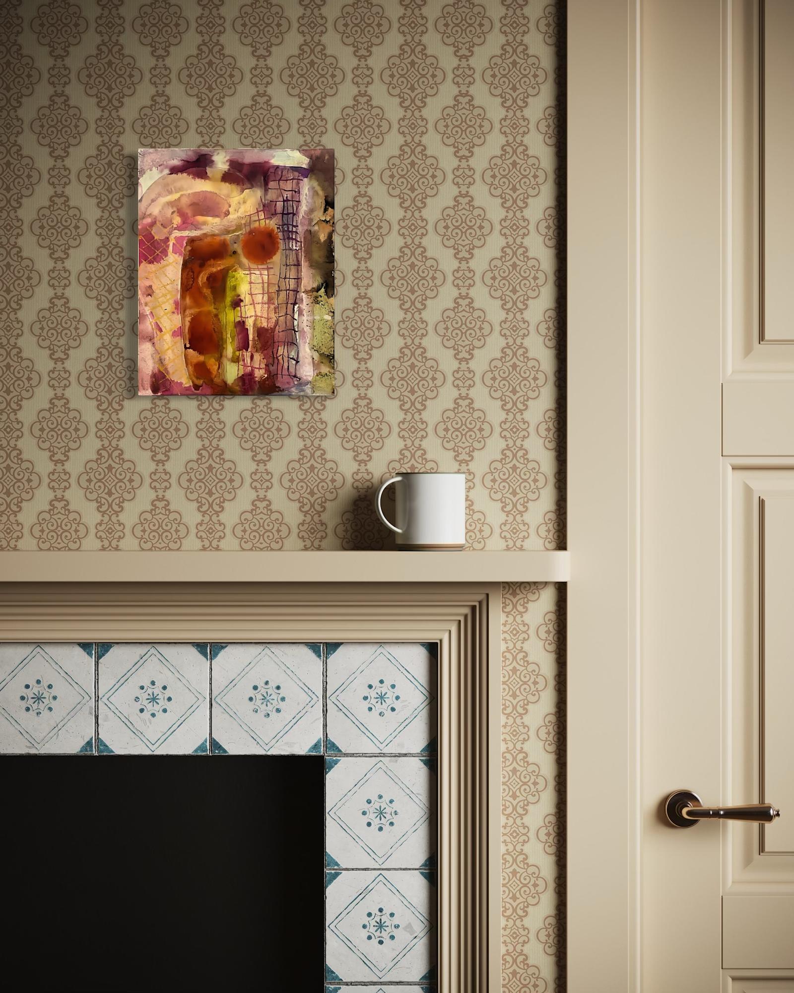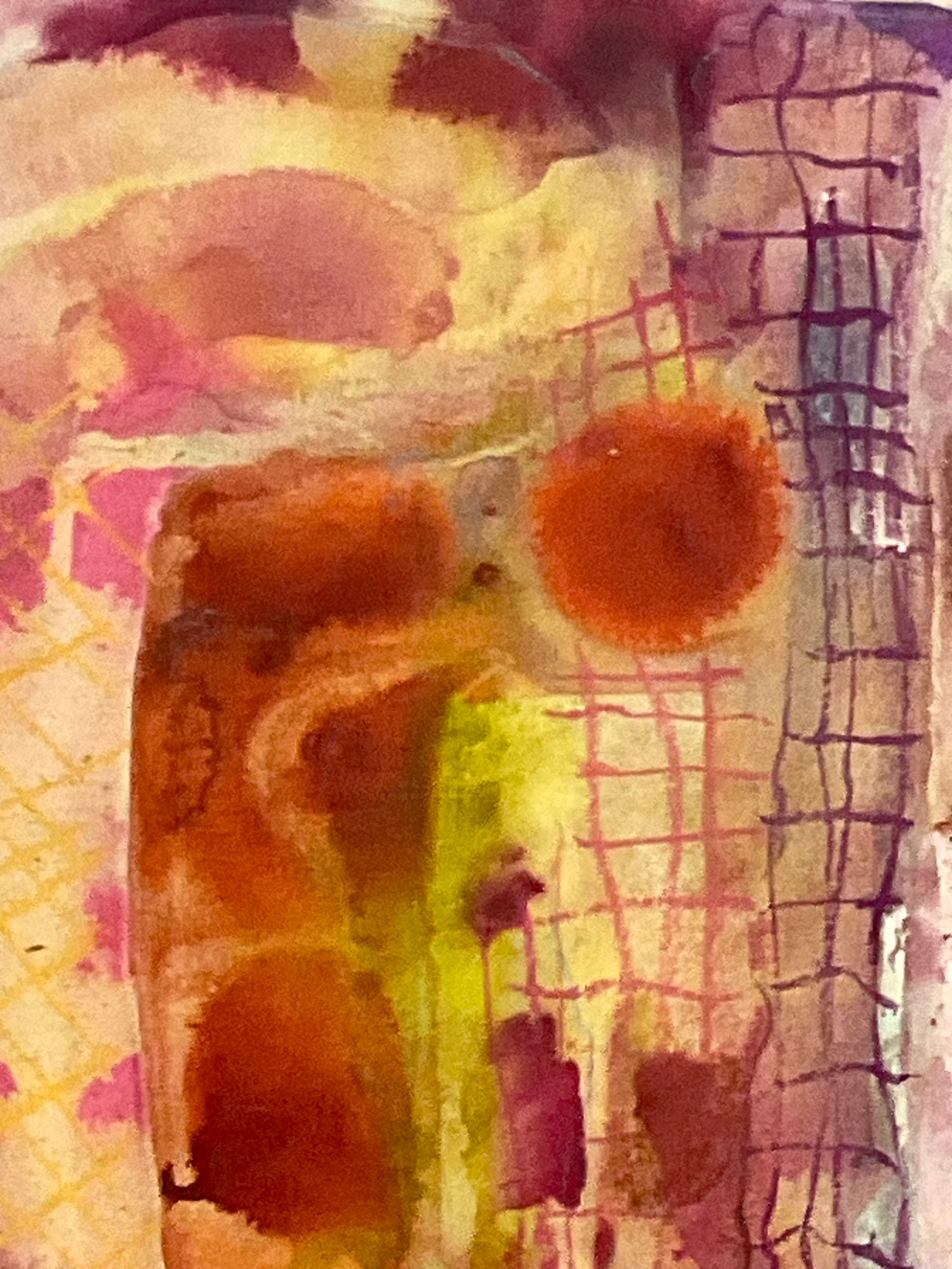 This abstract painting by Jeanne M. Connolly is a rich, expressive interplay of gesture, translucency, and layered intensity. Using a combination of acrylic, watercolor, ink sticks, dye, and gouache, Connolly builds a luminous surface where deep rust tones, vivid purples, and acidic yellows swirl and collide. Gridded marks—some sharp, others softened by bleeding edges—anchor the composition within a field of warm, organic movement.