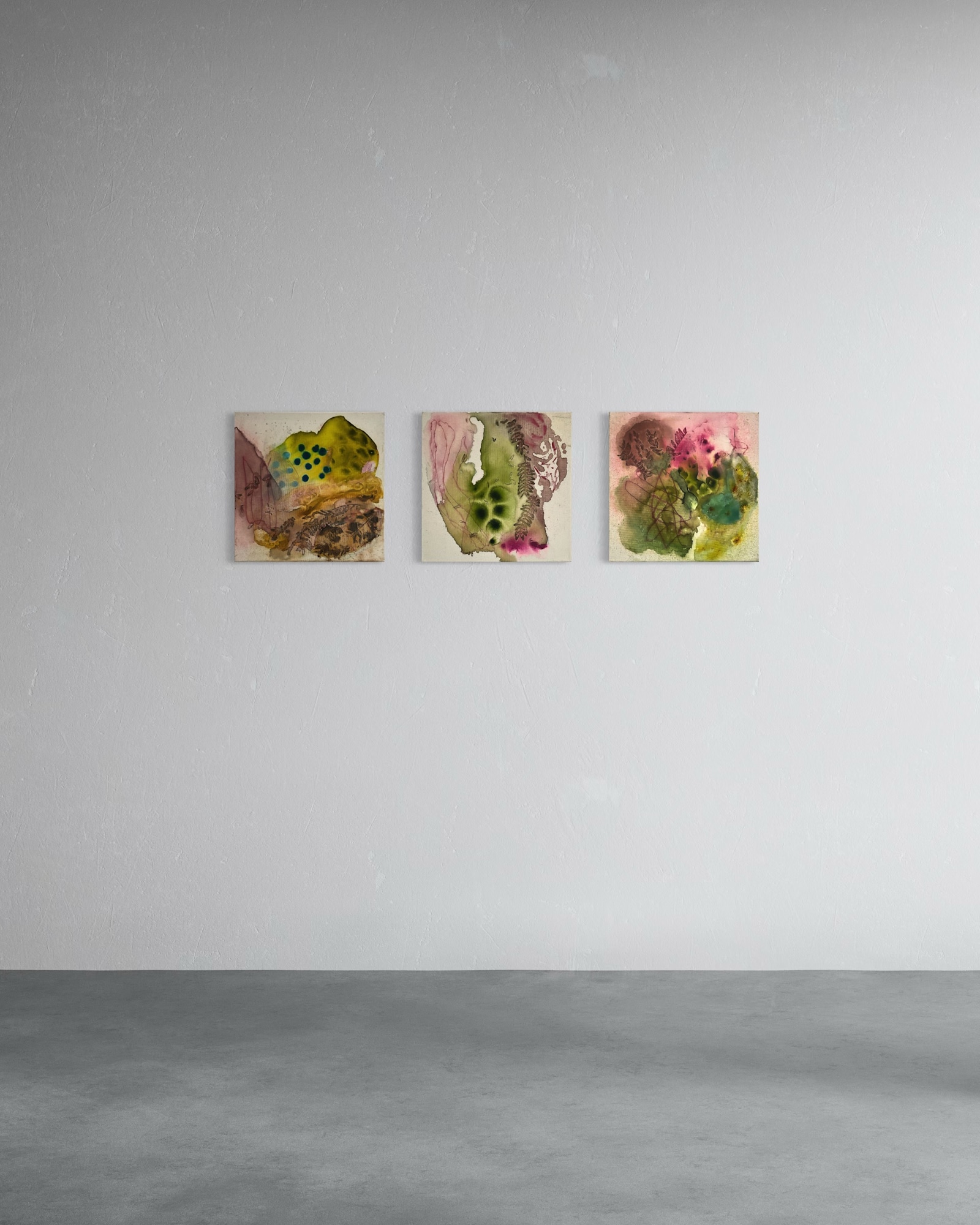 This vibrant abstract painting pulses with organic energy, evoking the mysterious world of algae. A dominant patch of bright yellow-green stretches across the upper canvas like a living organism, peppered with deep teal-blue circular forms that resemble cellular growth or spores. Below, earthy tones of ochre and sienna transition into layered browns, giving the impression of sediment or underwater textures. Soft washes of rose pink and maroon bleed into the left side, interwoven with gestural lines and delicate plant imprints that suggest movement and decay. The overall composition balances rich texture with biomorphic abstraction, creating a living, breathing ecosystem within the square frame.