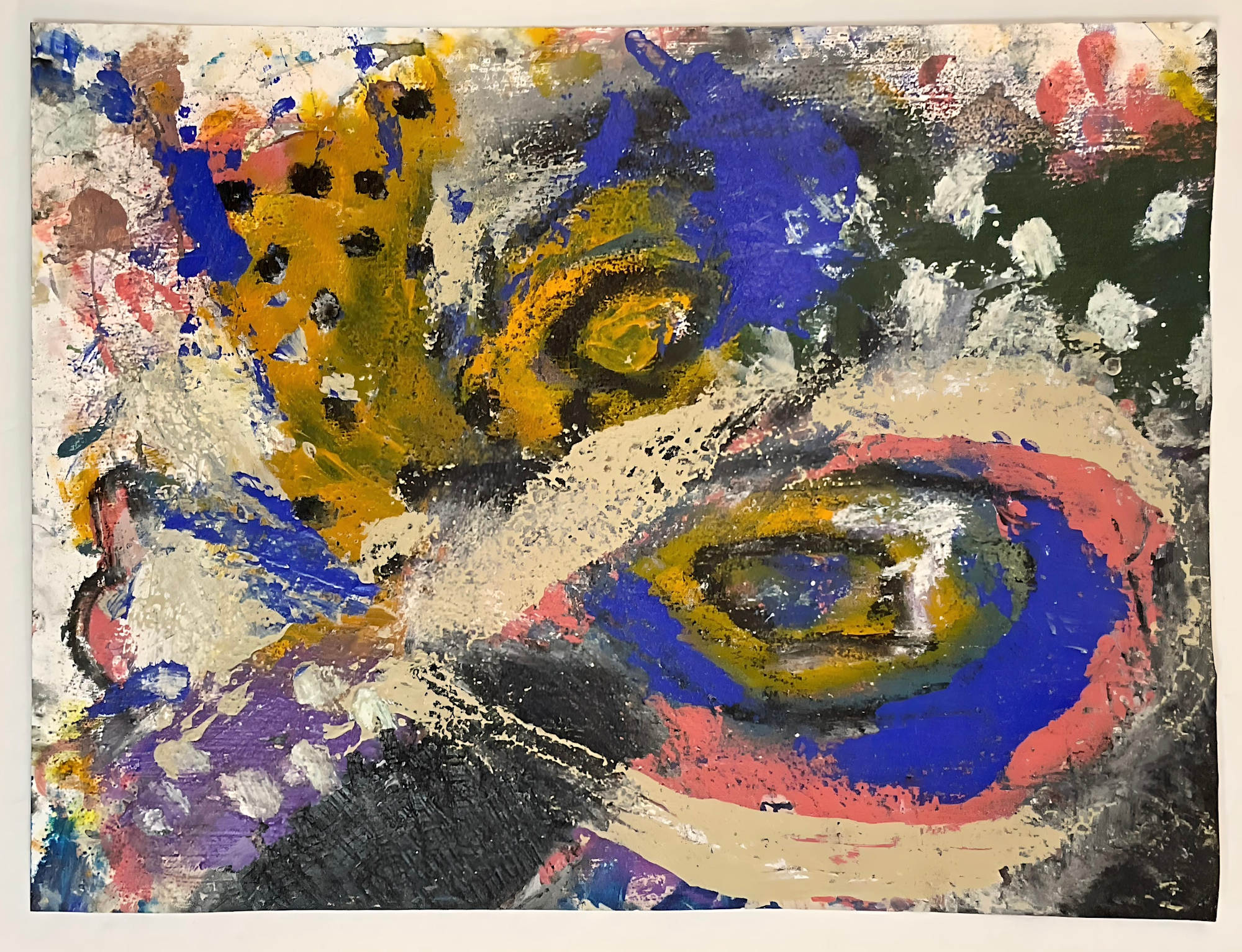 The Emotive Pulse vibrates with an intensity that seems almost alive. At its center, layered orbs of ochre, indigo, and coral radiate outward, resonating like the steady beat of a heart. Around them, bold swaths of gold, violet, and blue collide with bursts of dotted texture, creating a rhythm that alternates between chaos and order. The addition of Mediterranean sand enhances the surface depth, grounding the fluid motion of high flow acrylic and the forceful marks of oil pastels. This work embodies the heartbeat of the series — a visual translation of the energy and emotional cadence that binds the collection together.