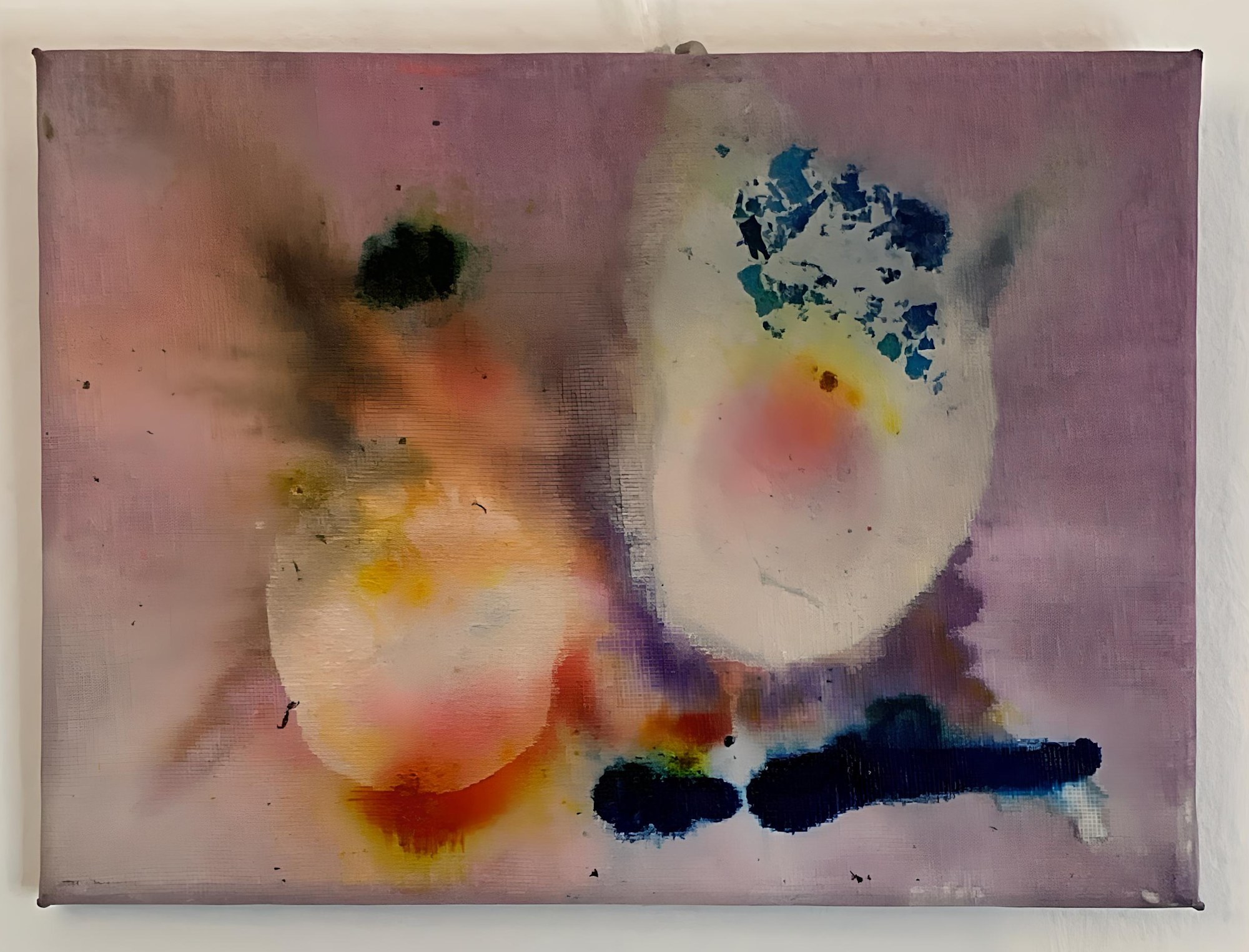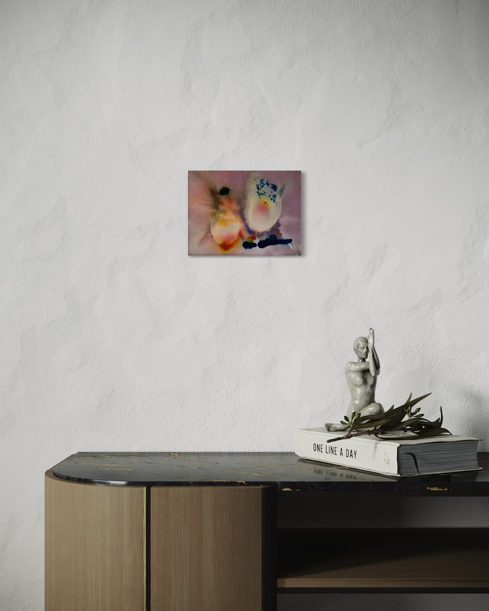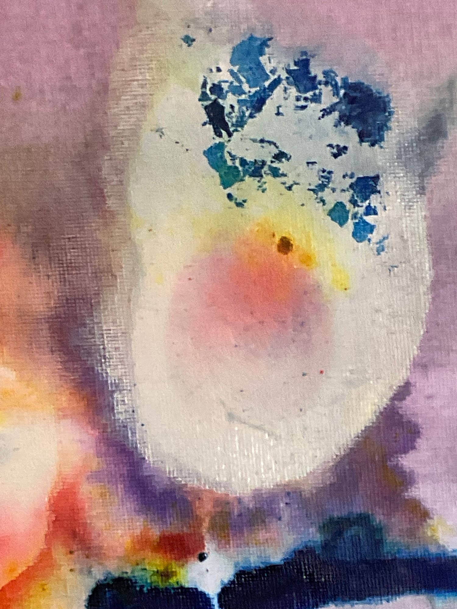 In Whisper, soft forms emerge from a veil of violet and rose, suggesting fleeting impressions that hover between silence and sound. Two luminous orbs anchor the composition—one glowing with warmth, the other crowned with textured flecks of blue—while deep indigo strokes ground the scene with quiet intensity.