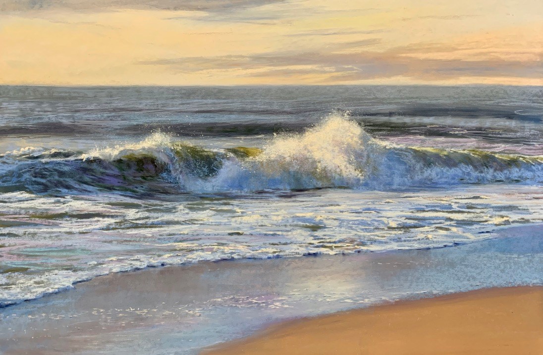 Early morning walks on the beach are my favorite part of the day, and this painting highlights the warmth lighting up the foam of a crashing wave, reflected in the wet sand below. Warms and cools work in quiet conversation here, perhaps suggesting why this makes the perfect time of day for reflection. Location: Long Beach Island, NJ