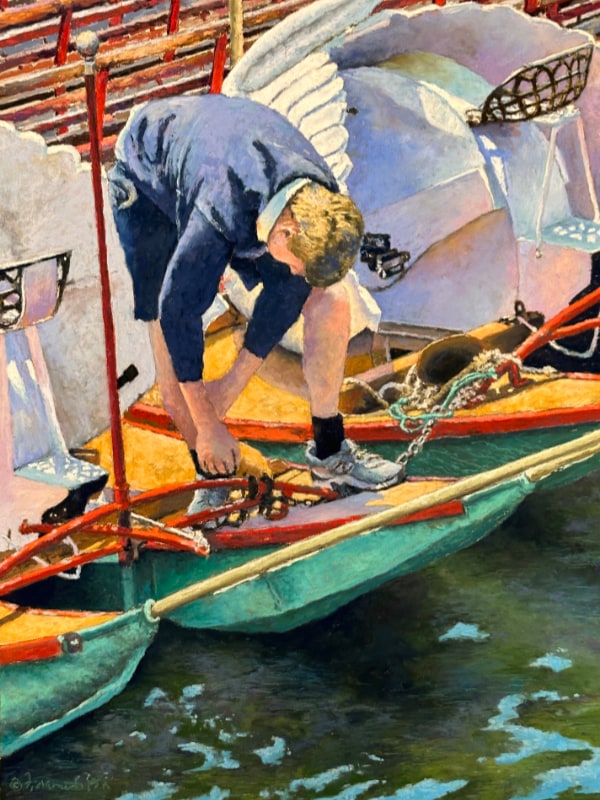 Depicting the Swan Boats in the Boston Public Garden at the start of the day
