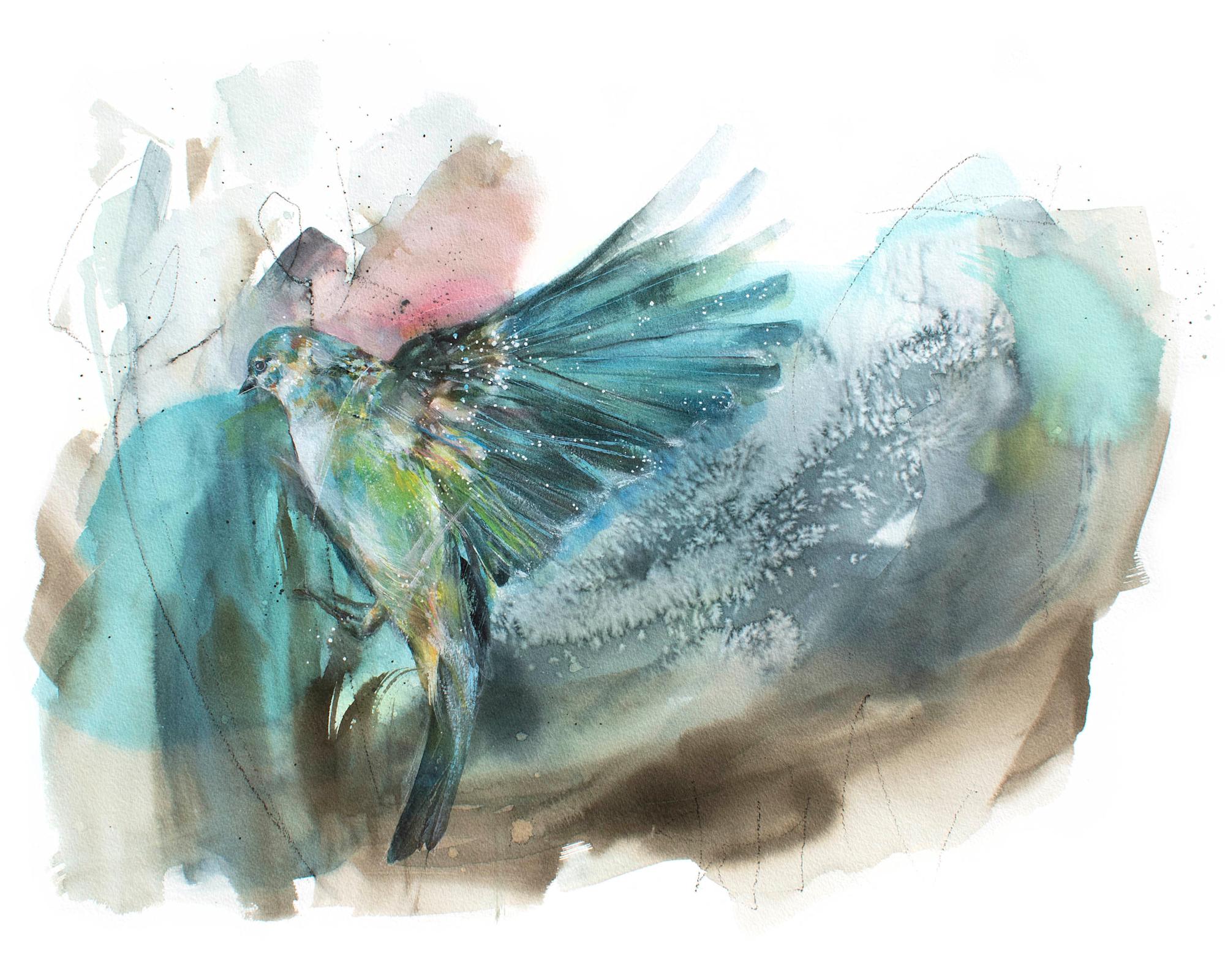Swirling washes of aqua blue, earthy burnt umber, and a delicate touch of crimson infuse this vibrant painting with dynamic energy and fluid motion. At its core, a bird soars mid-flight, its graceful flutter imbued with a dreamlike serenity. The piece radiates a sense of freedom and bliss, inviting the viewer into a moment of pure, tranquil beauty.