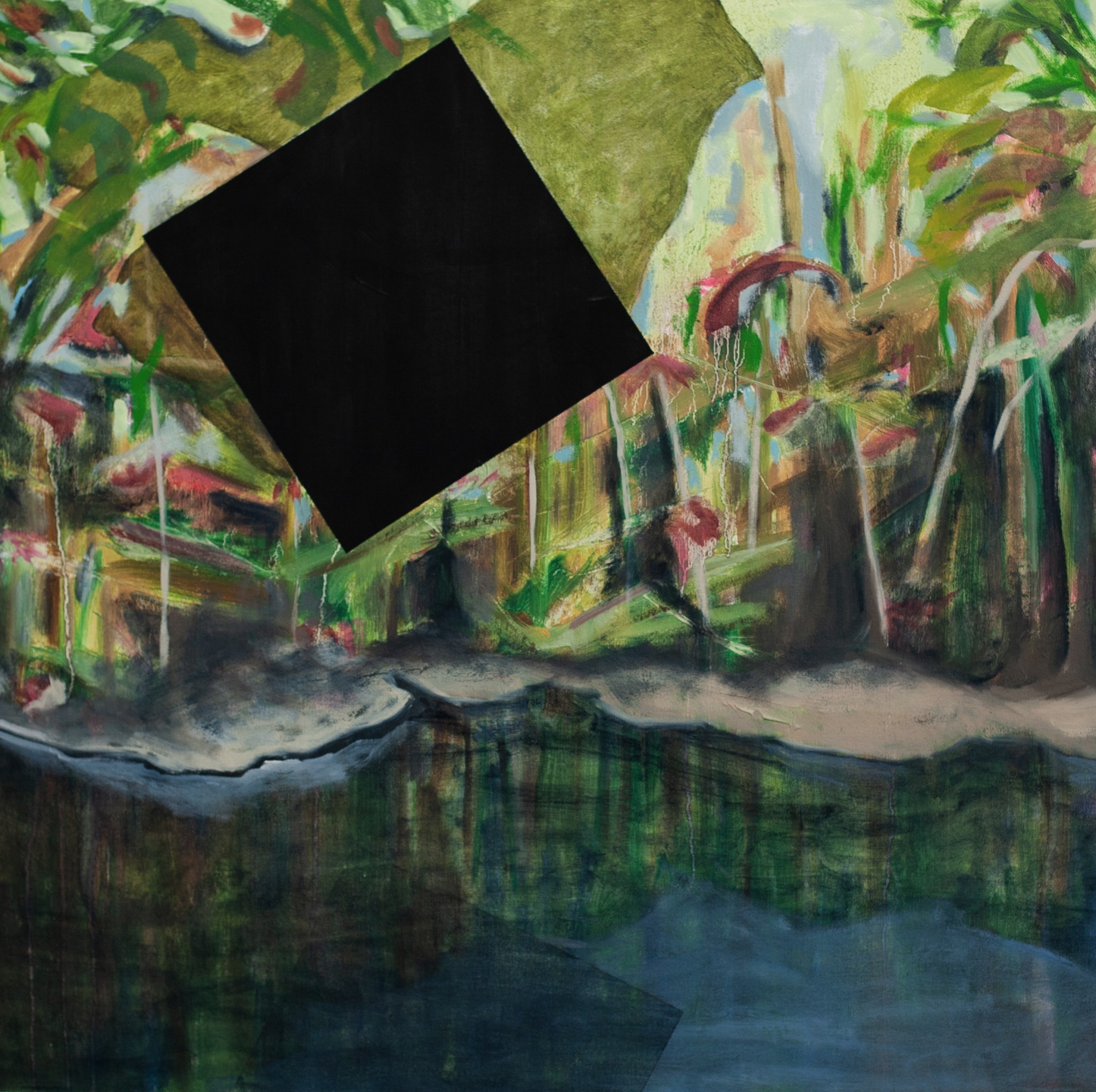 Set against a lush, organic landscape, the stark geometry of the black square disrupts the harmony of the natural world, forcing an unnatural presence onto an environment that resists definition. Unlike the urban spaces of other works in the series, this scene suggests a different kind of imposition—one that speaks to broader tensions between control and the wild, between imposed structures and spaces that refuse containment. Painted at a time when protests for Hong Kong’s autonomy unfolded alongside global environmental demonstrations, this work reflects the intersection of political and ecological struggles. The black square here is not only a symbol of defiance but also a manifestation of control, confronting the tension between authority and autonomy—what happens when forces, whether political, industrial, or ideological, attempt to confine and dominate that which desires to remain free.