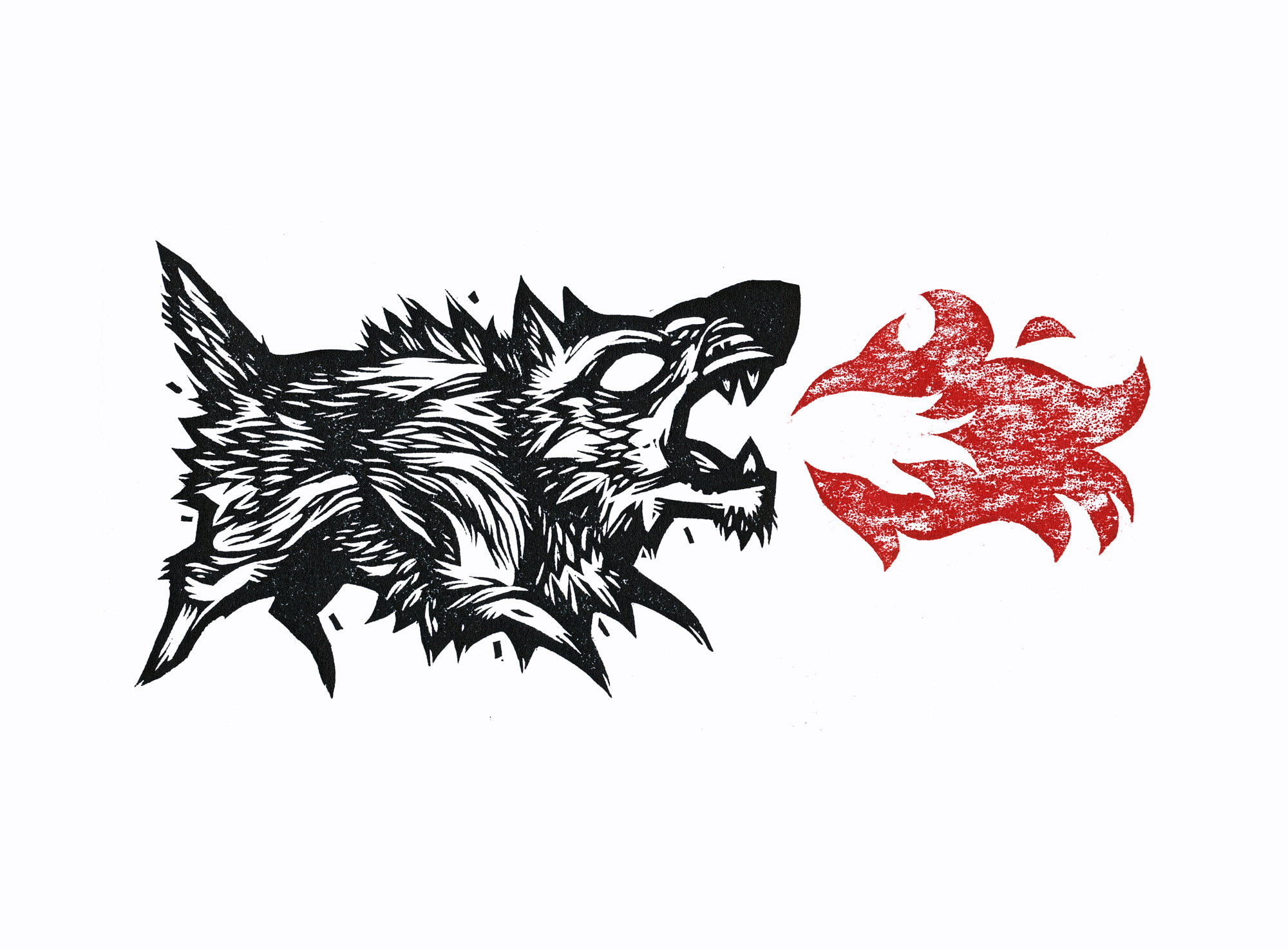 Linocut of primitive dog breathing fire.