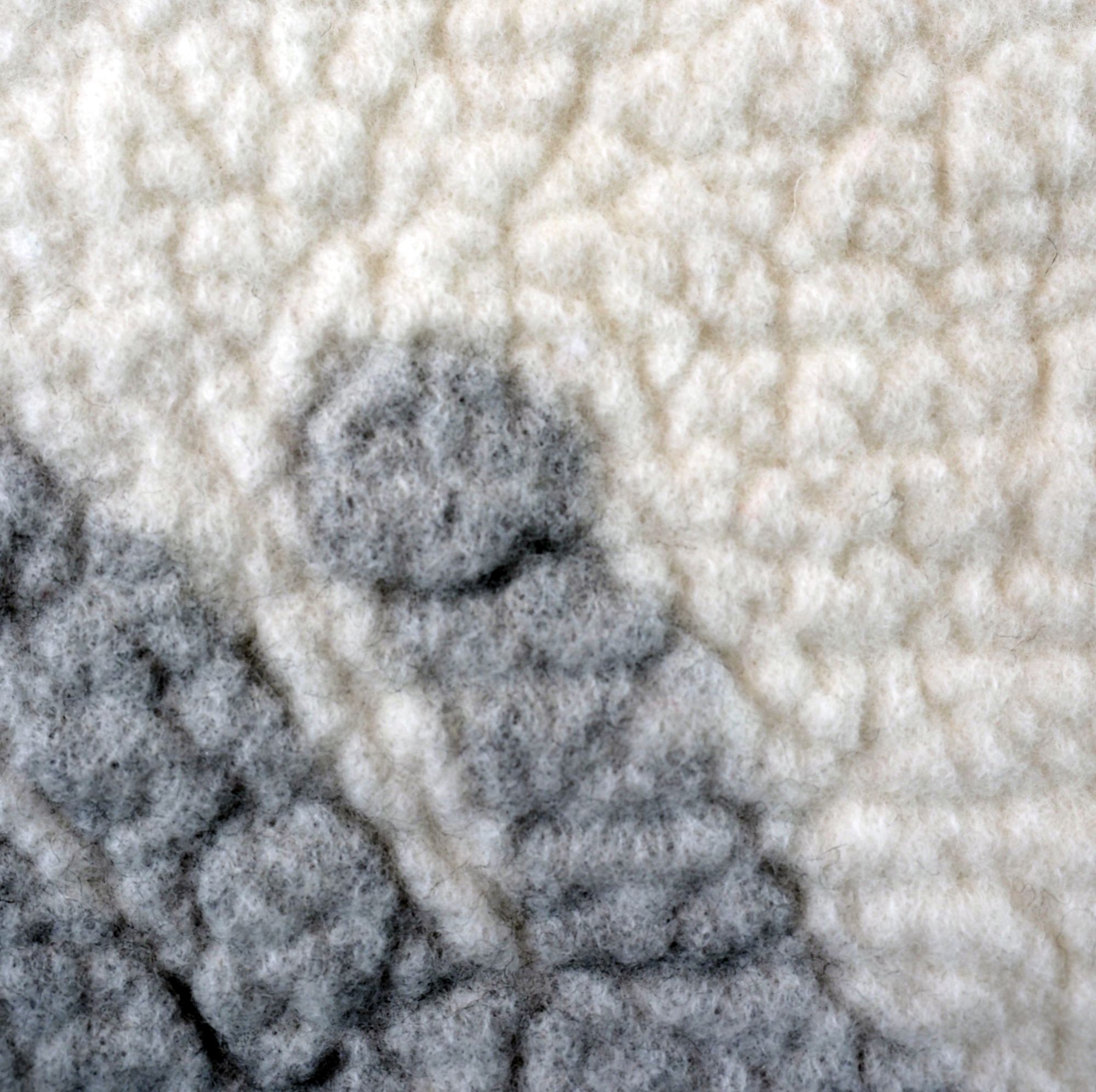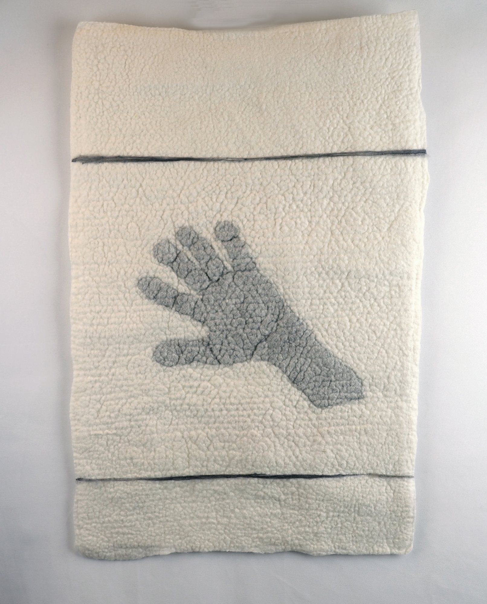 This wet-felted artwork features an outstretched hand, softly textured in shades of gray against a neutral background. The hand's upward gesture invites reflection on connection, longing, and the desire to touch the intangible. The tactile nature of the felt mirrors the warmth of human interaction, while the minimalist design emphasizes the quiet power of a simple gesture. Reach is a reminder of the universal need to extend ourselves toward others, symbolizing both vulnerability and strength.