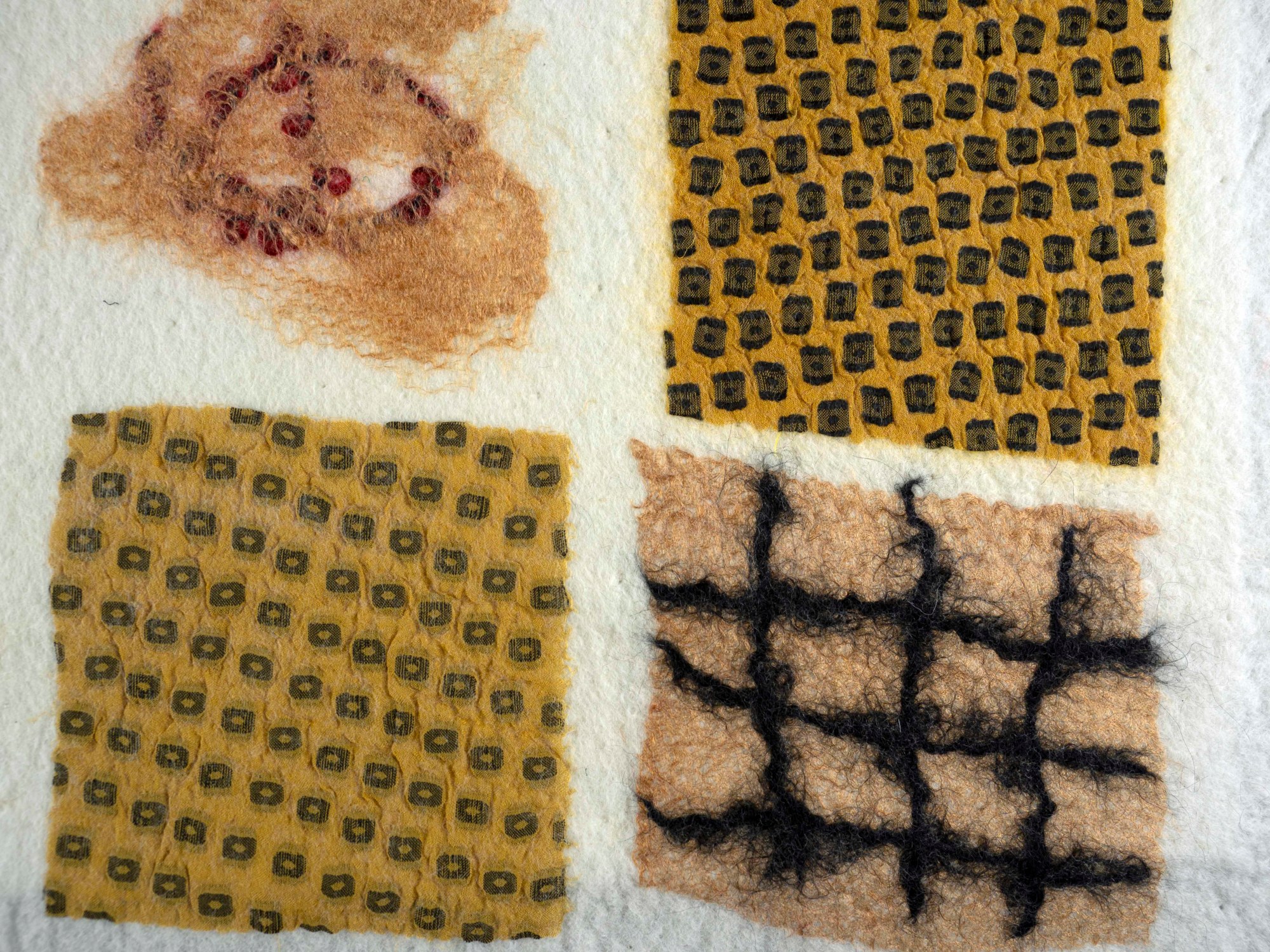 “Sunflower in the abstract #9” is a contemporary felted wall art composed of a 3x3 grid, each square is a canvas of texture and pattern, from polka dots and stripes to swirls and grid lines. The neutral color scheme of beige, brown, and black lends the artwork a sophisticated and modern aesthetic. This piece invites the viewer to engage with a playful yet refined take on the concept of interactive art.