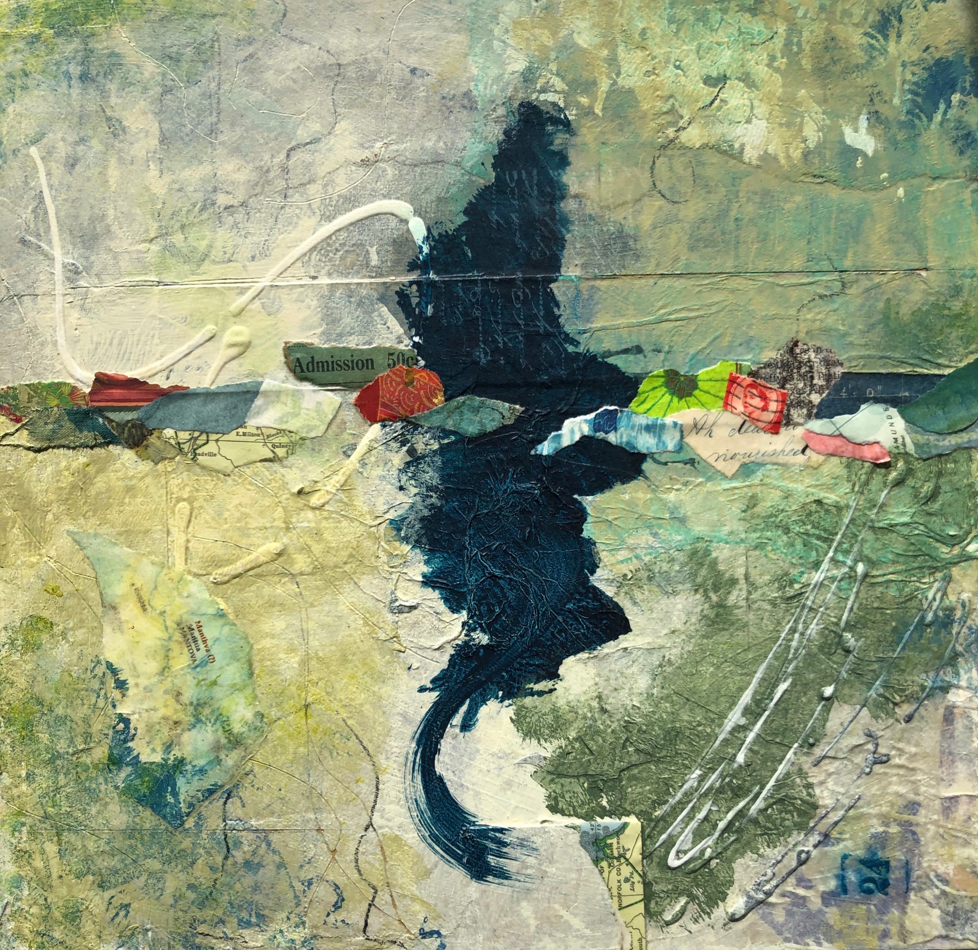 A fun energetic abstract painting utilizing collage material combined with acrylic paint in blues and greens and lots of texture.