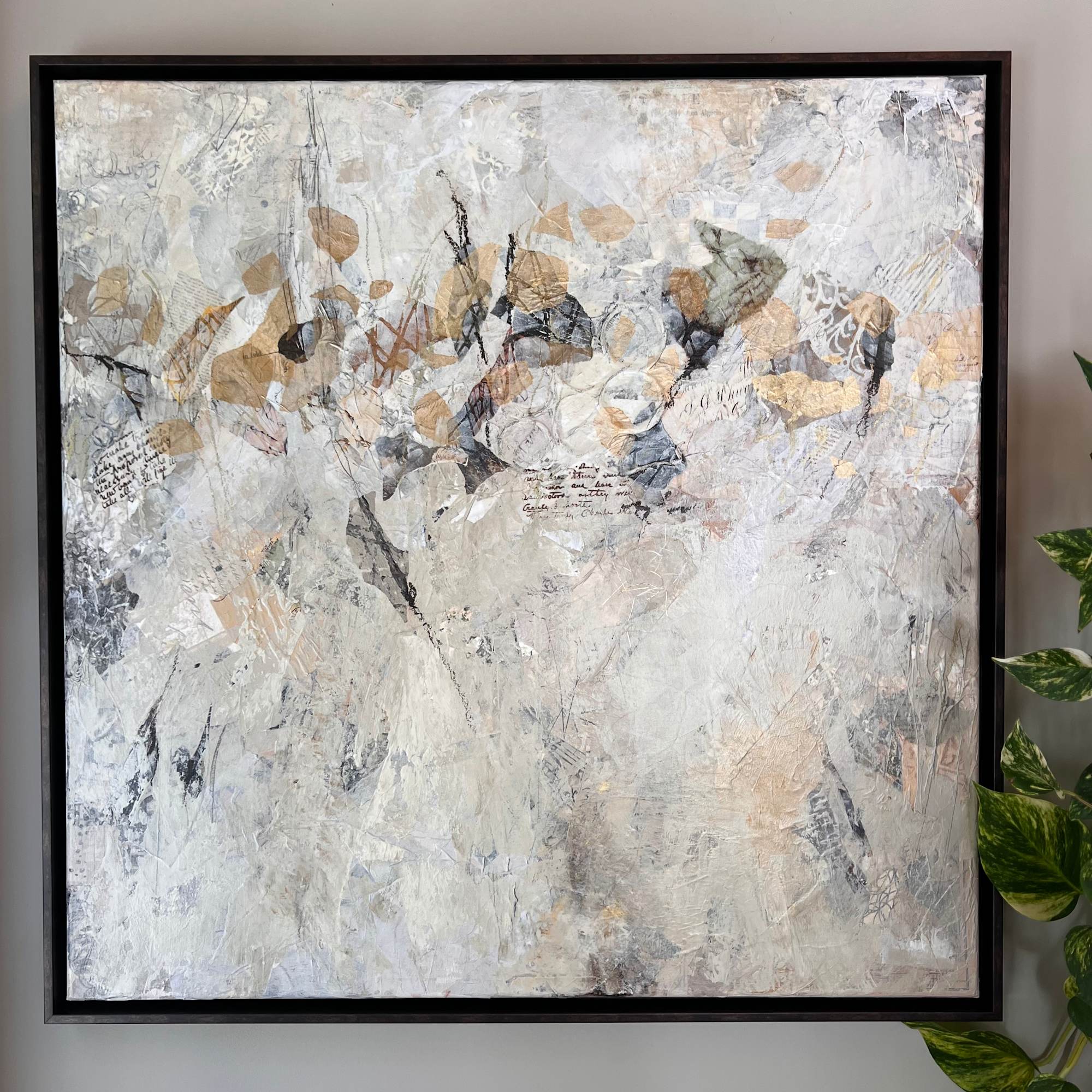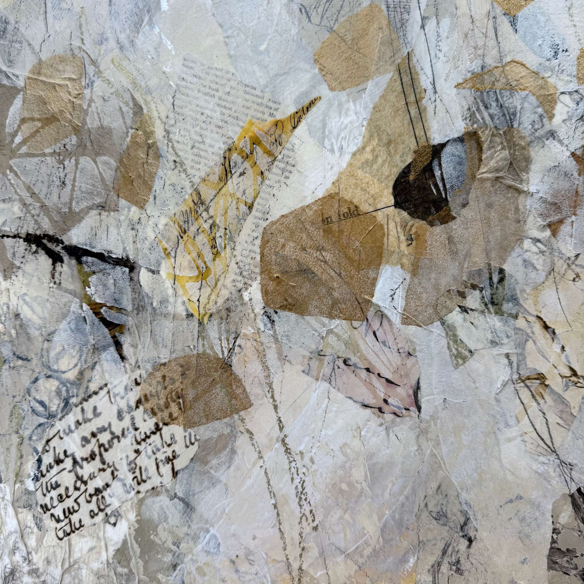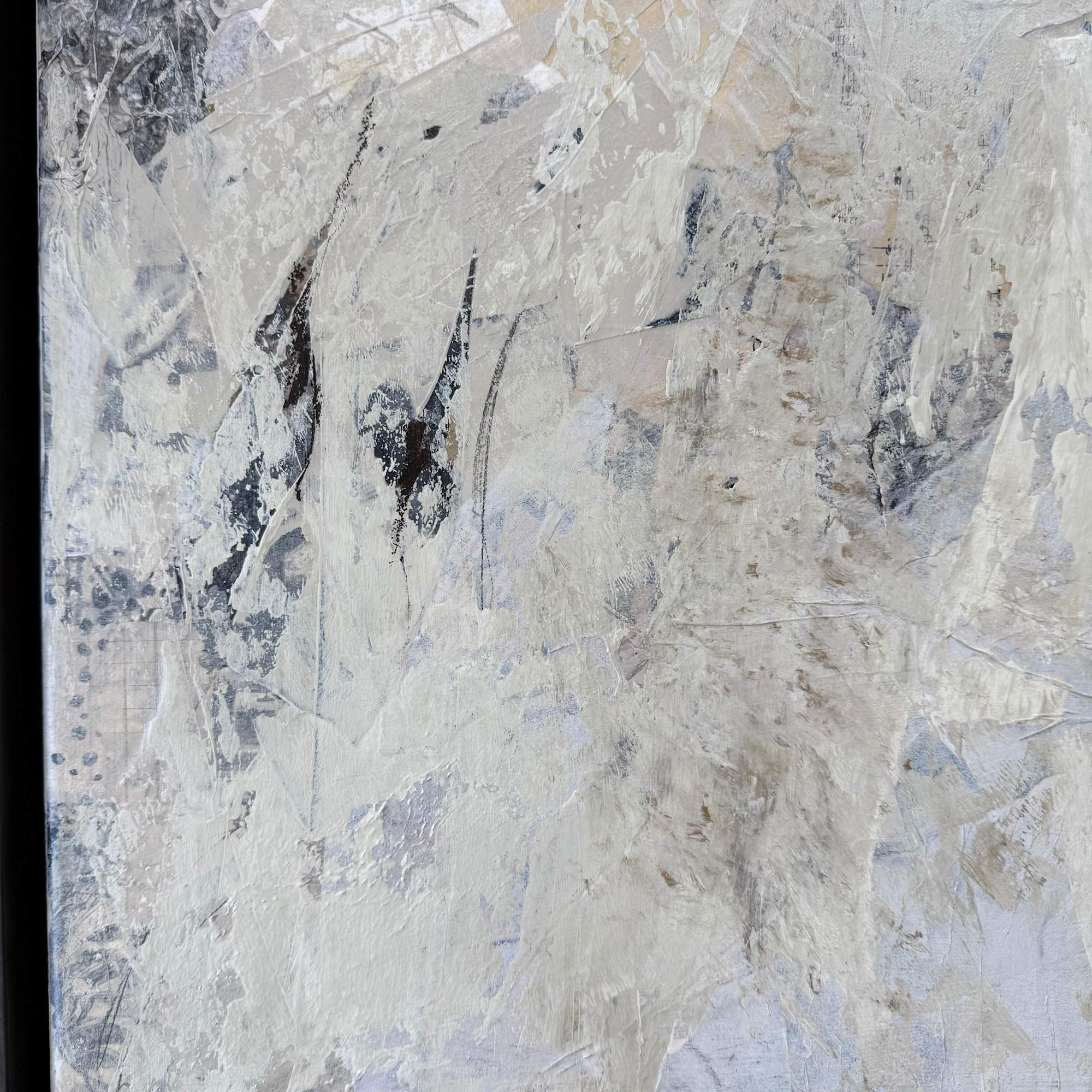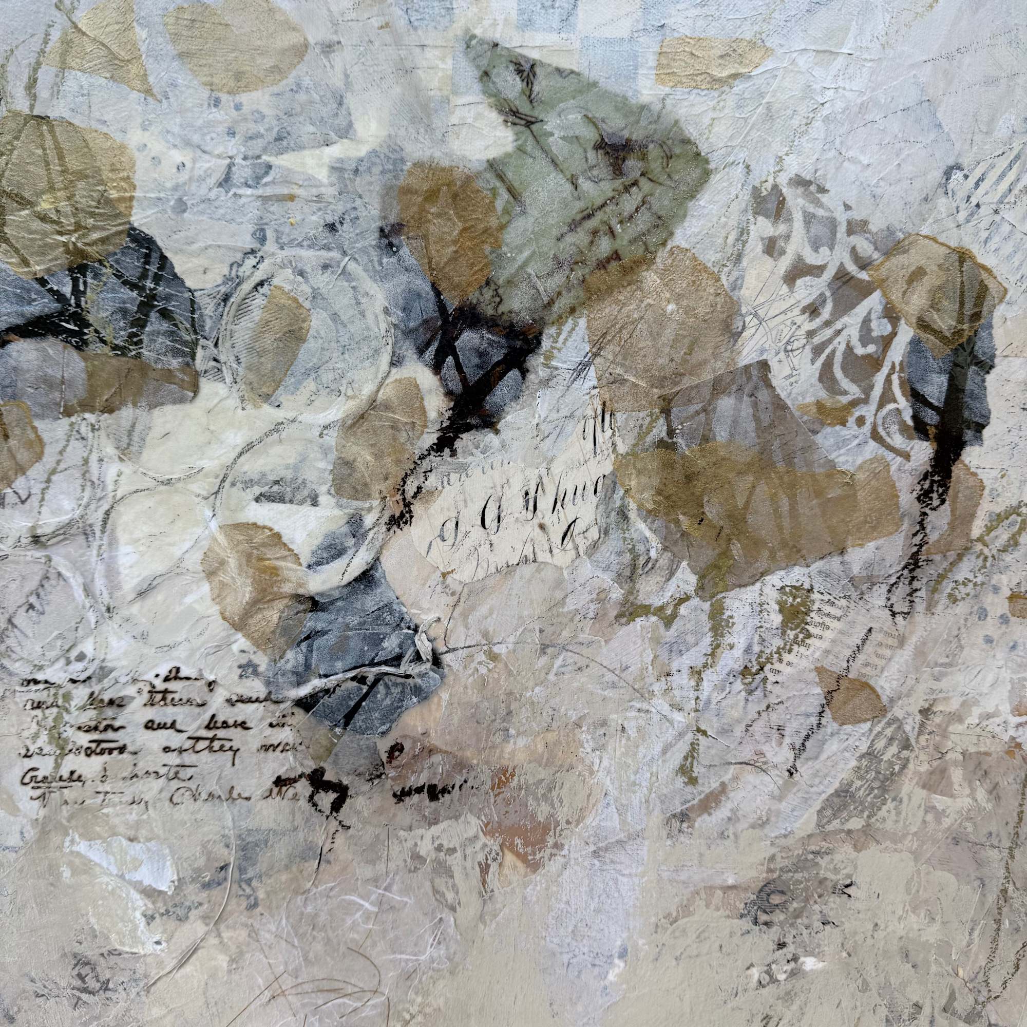 Colors include sepia tones, cream, white, black, tan and hints of shimmering gold. Overall, a very neutral painting with lots of interesting bits.