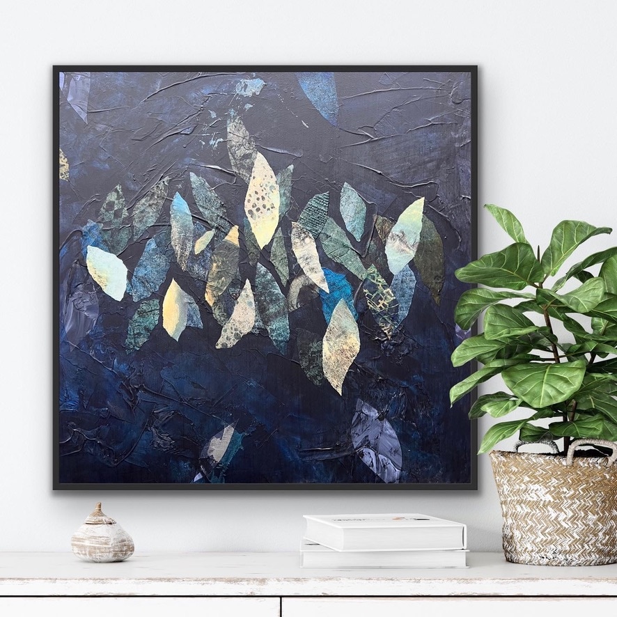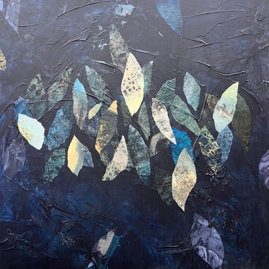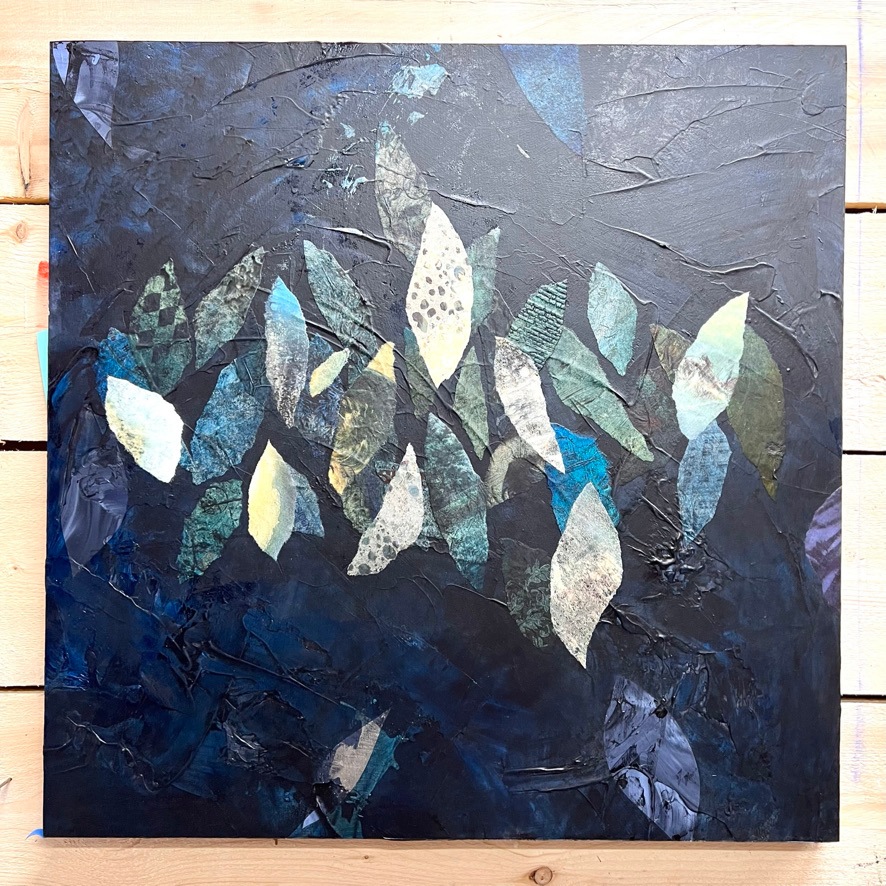 A deep and rich navy blue painting with lots of layers of indigo create a moody vibe. The added ephemera in contrasting colors creates graceful movement. This is a painting you can stare at and always see something new.