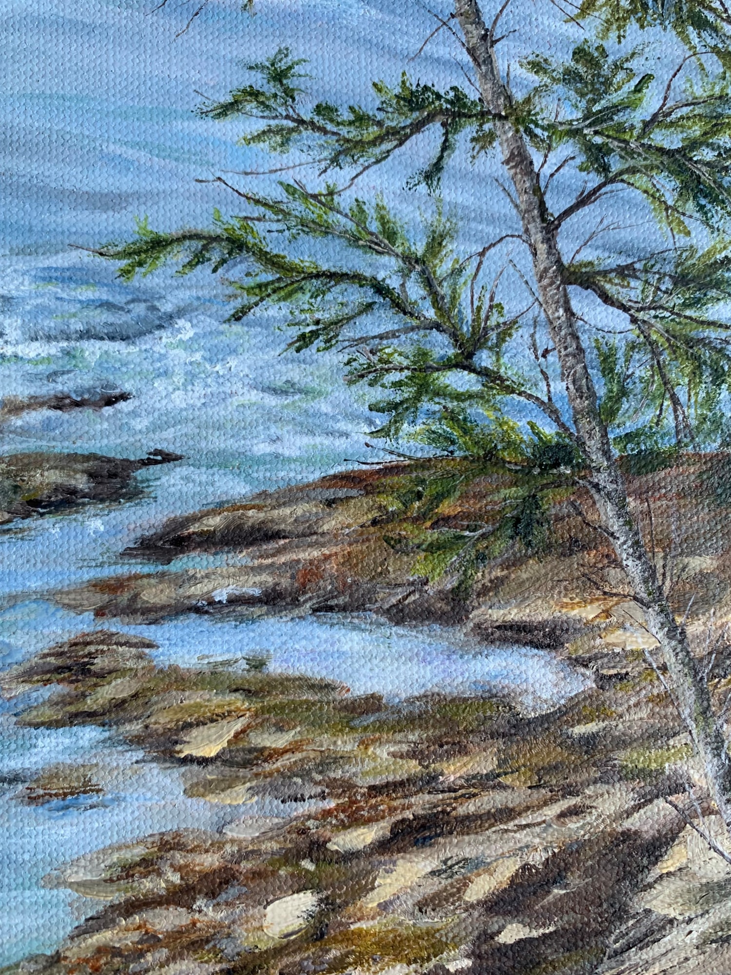 It's magical to capture a lone young pine swayed by the wind and following the sun, perched on a rocky shoreline. The grey sea was a perfect backdrop the day I captured this!