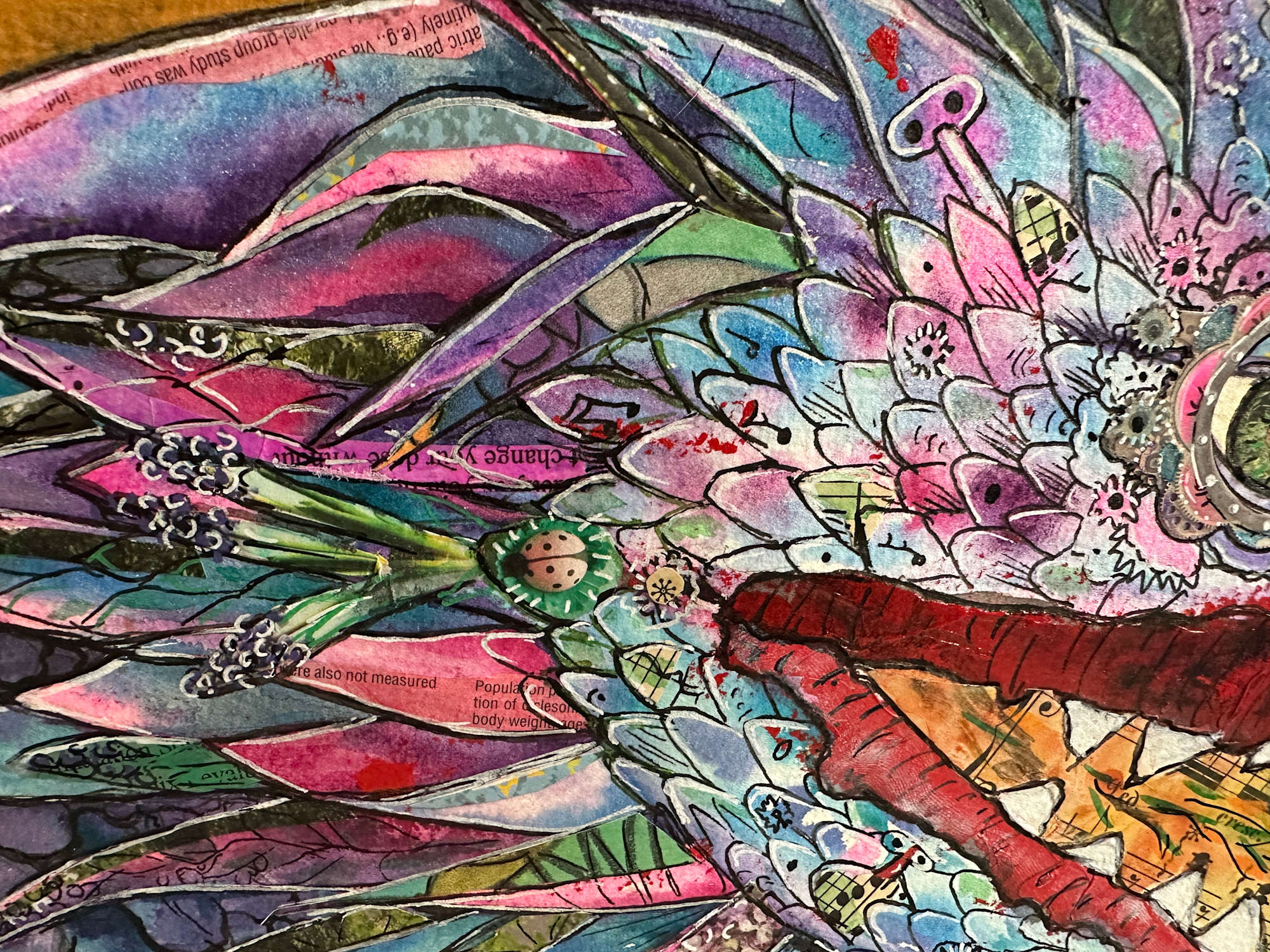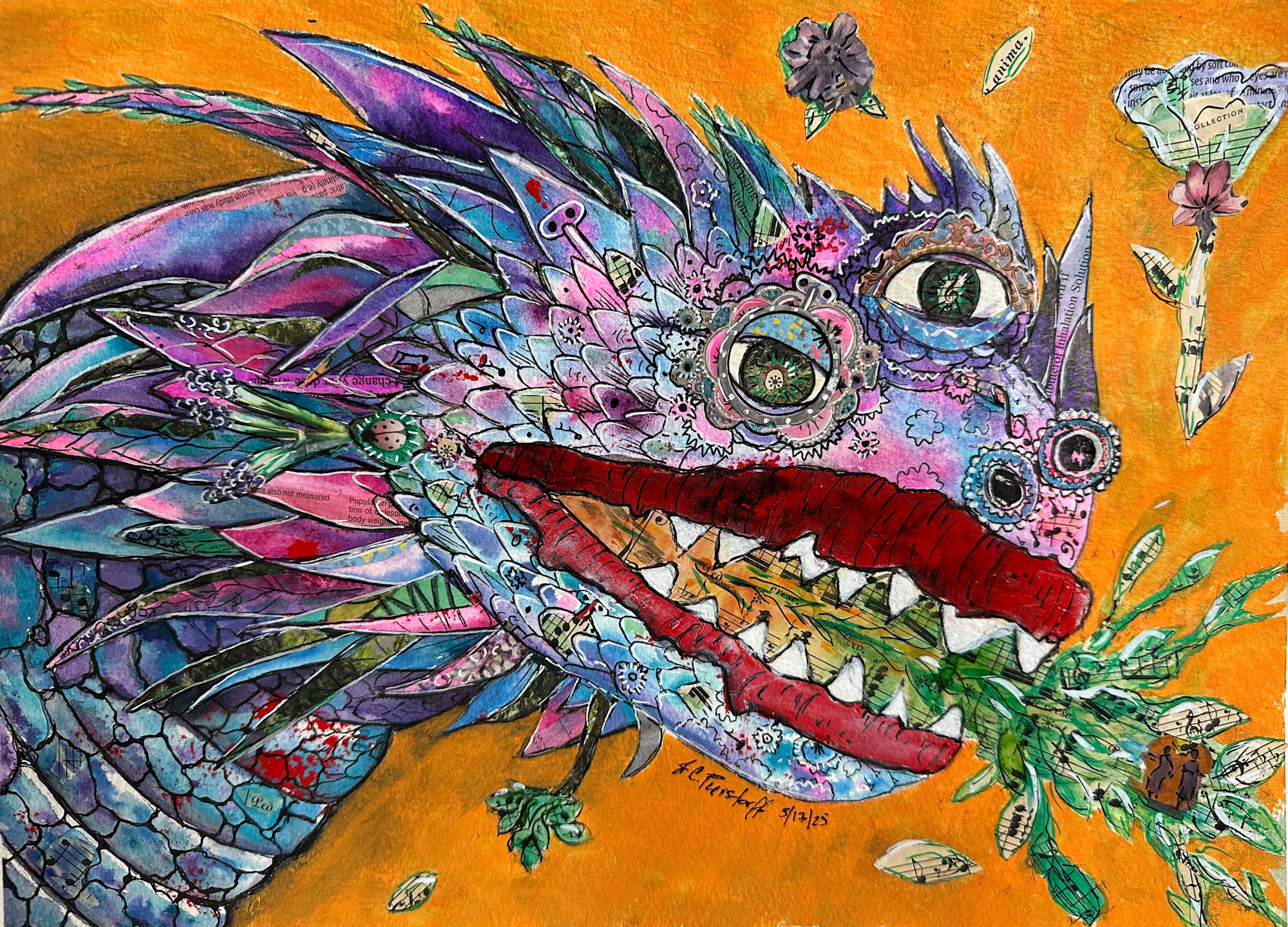 He does not breathe fire—he breathes song. Vines entwined with sheet music flow from his mouth, alive with rhythm and light. They twist through the air, calling softly, luring the curious closer. Born of flowers, metal, and medicine, he transforms destruction into creation. “Steve’s Dragon Spits Vines of Music” turns danger into melody—beauty born from what might have burned.