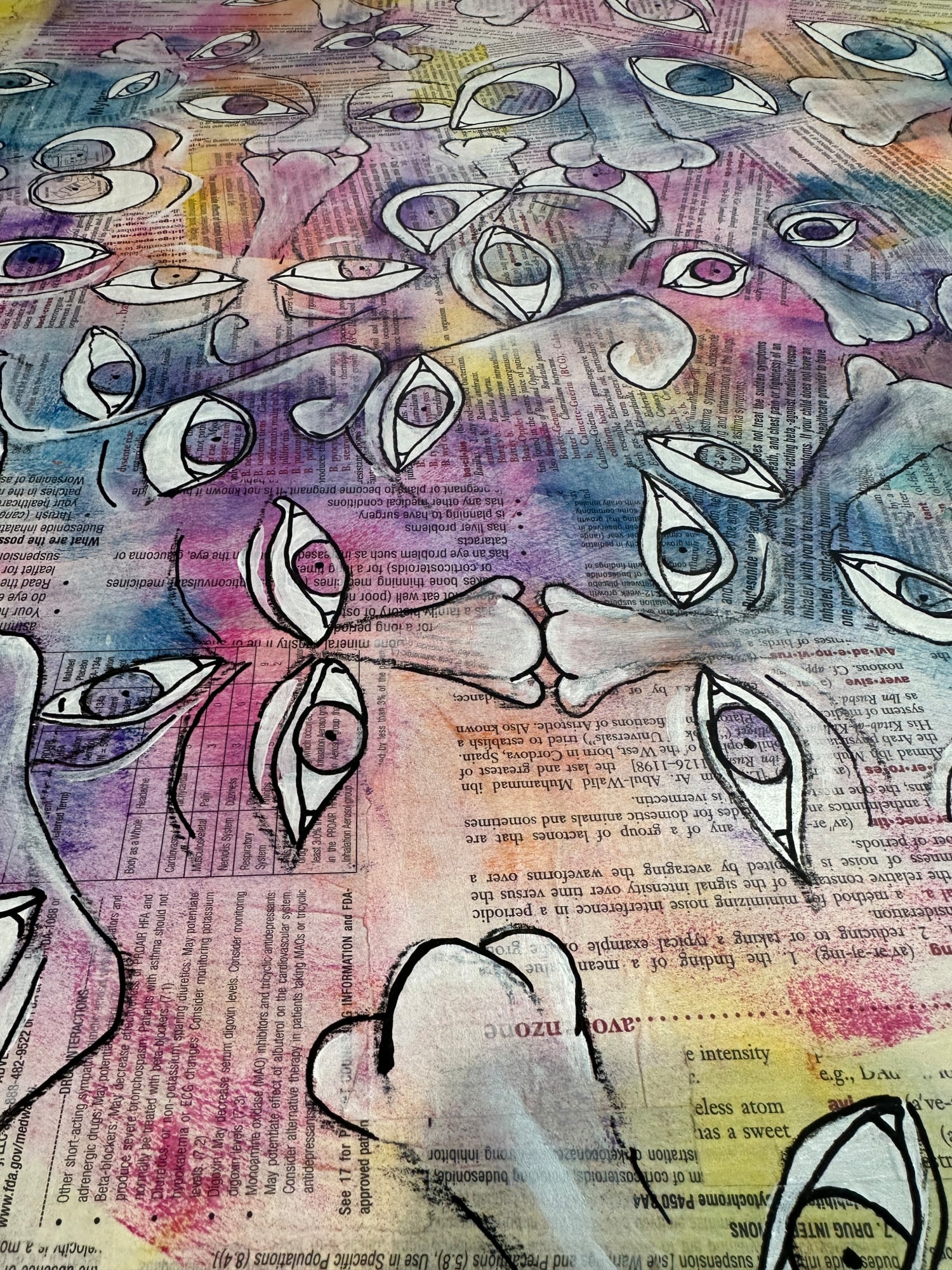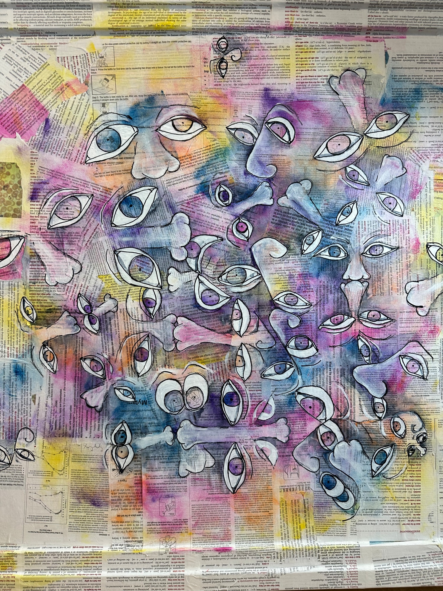 Our voices fall on deaf ears. As patients, we have to endlessly advocate to get help. The sea of eyes is on pharmacy inserts and medical dictionary page. The lack of mouths symbolize our voice in our own health care. The glowing eyes represent the dis-ease that is always there. It is just another part of the Patient Experience.