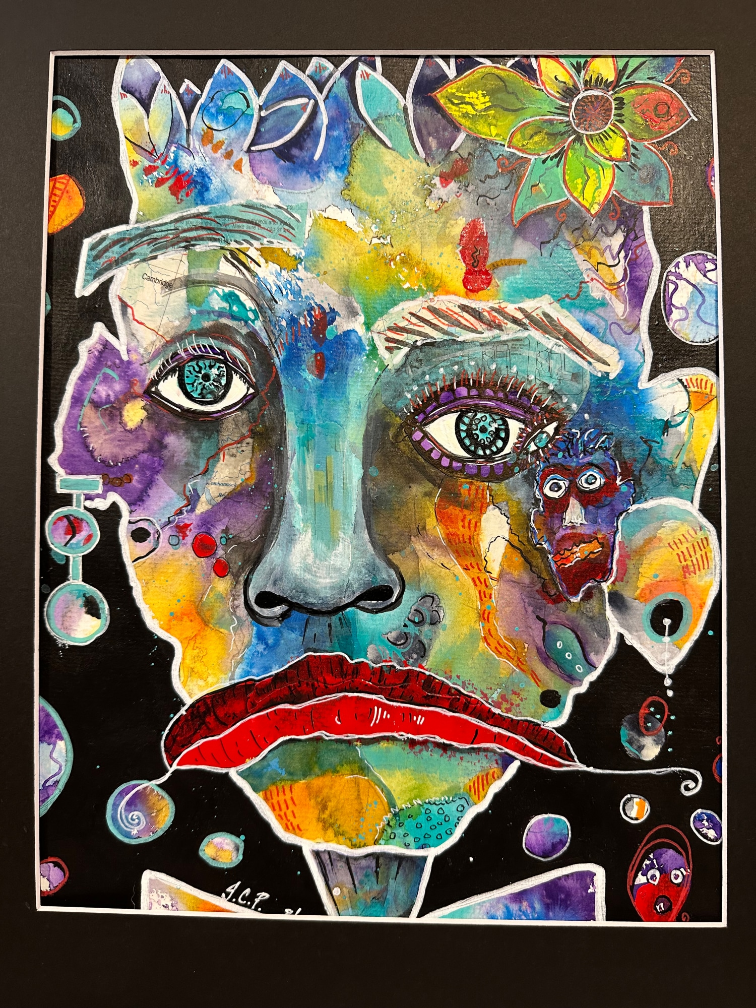 Art always tells the truth in my emotion. The faces that swarm her sad eyes represent the outside influences controlling my situation. Humanity is complex, we can be strong, sad and grateful at the same time. My beloved flowers and leaves make their appearance like a crown of growth on her. From the dirt, the beauty rises.