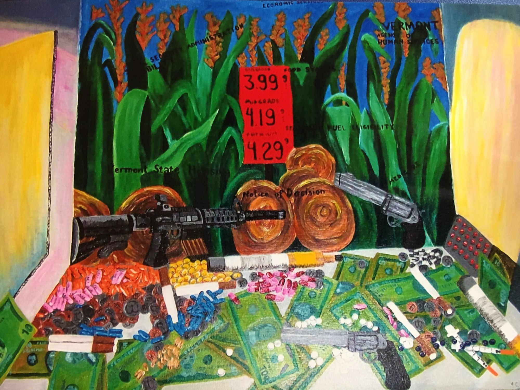 Privacy is an illusion when on disability, every aspect of my life is scene through the lens of the government. They decide my medications, my money, my food, my housing. The Vermont Box is a view of what decides my life. A screen shot painting. Guns, drugs and money rule America.