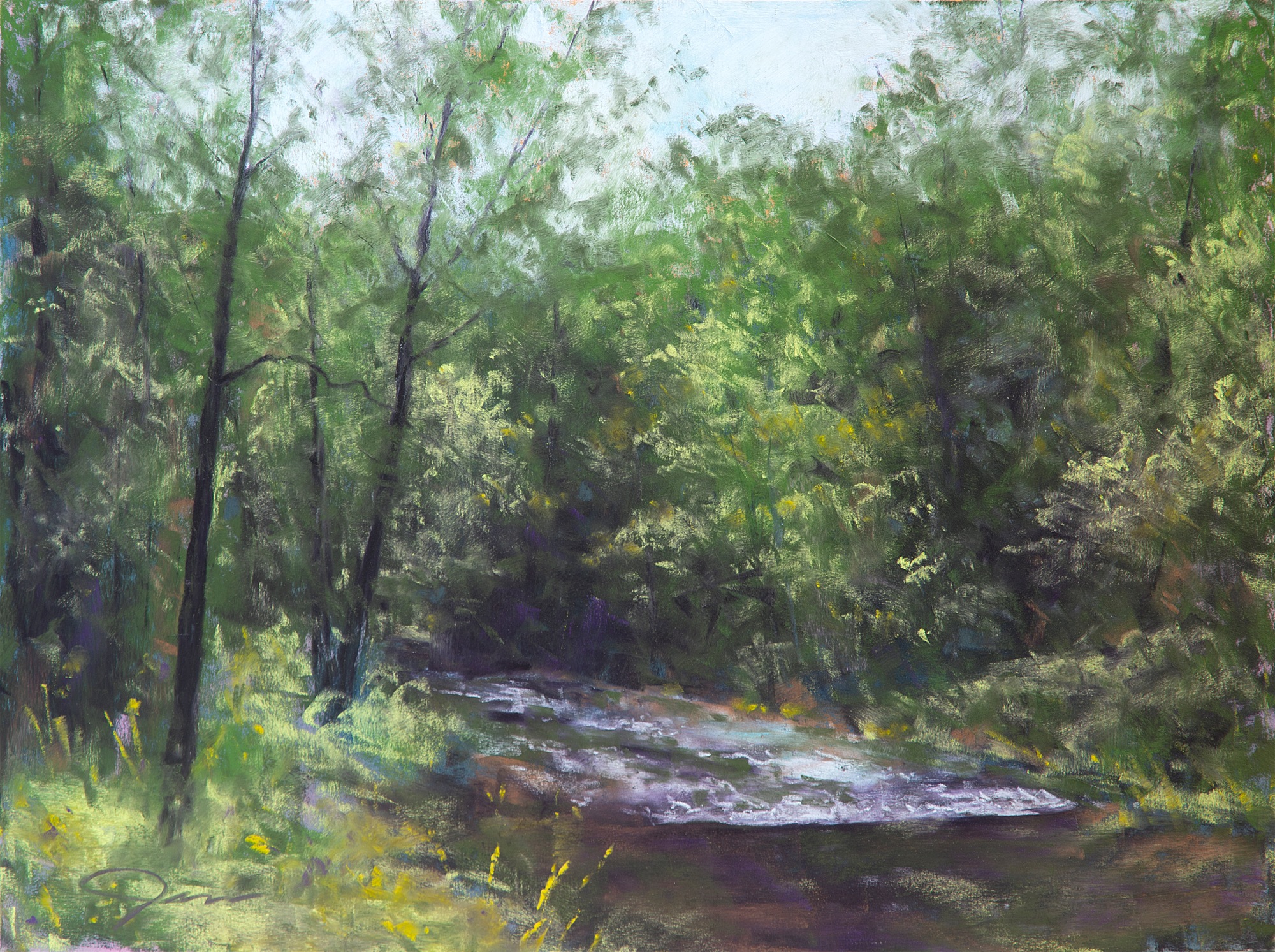 Since I had been on a tour of the Soaring Eagle Wetland a just a few weeks before with my fellow Hamer Foundation trustees, I arrived early to the site’s fishing platform to paint Bald Eagle Creek
