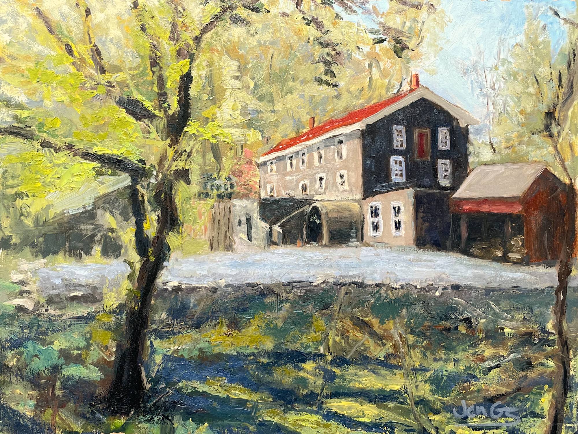 My painting "Dharma Bums," of the acclaimed Kerouac-inspired restaurant in Point Pleasant, was painted as part of the AOY Art Center's Paint Our River Towns Plein Air event. I loved how the solid stone building with crisp white window trim and a warm red roof anchored the scene in the upper right corner, offering a sense of permanence and quiet comfort, while the large tree with bright yellow-green leaves spread across the left side, full of life and freshness. The overall effect I aimed for is a peaceful scene that encourages contemplation and a renewed appreciation for the quiet beauty found in everyday rural settings.