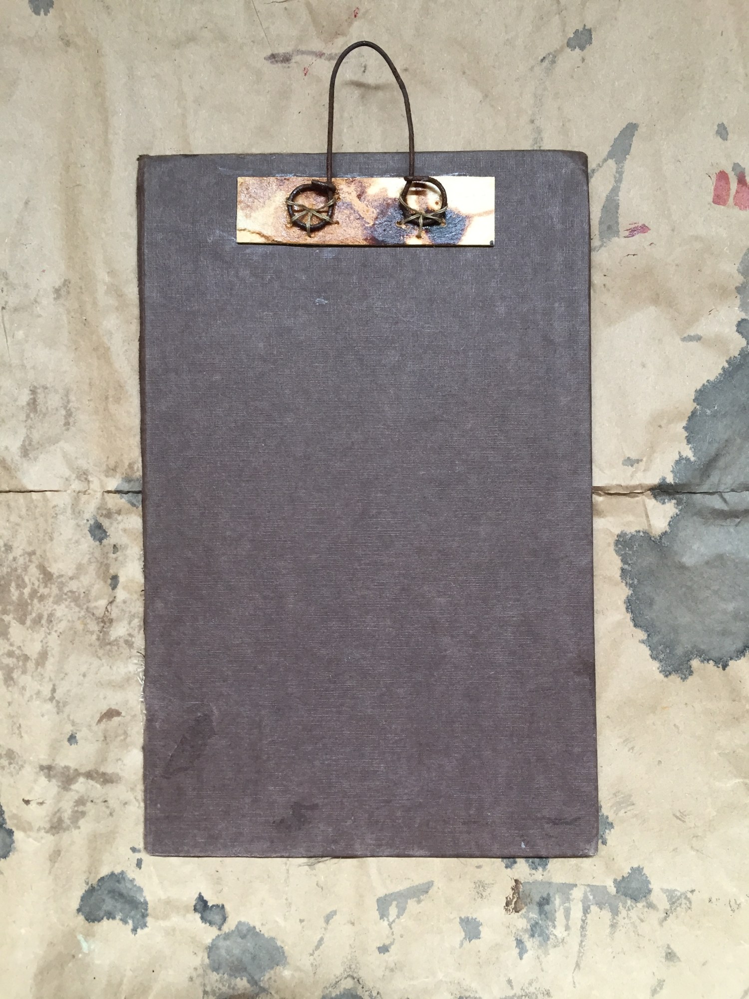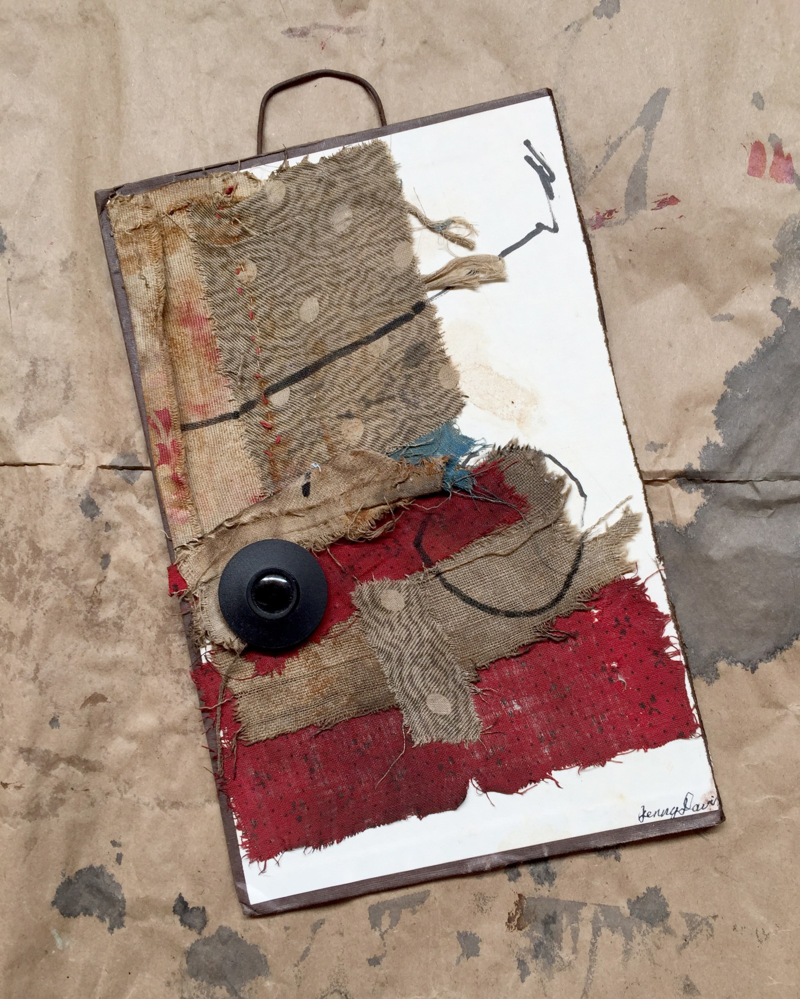 MED. Vintage book cover, antique textiles 1800's vintage button, textile pen, rusted wire, sealer on vintage book cover. Ready to hang with a carefully hand- sewn wire fence dropper. (Unframed)