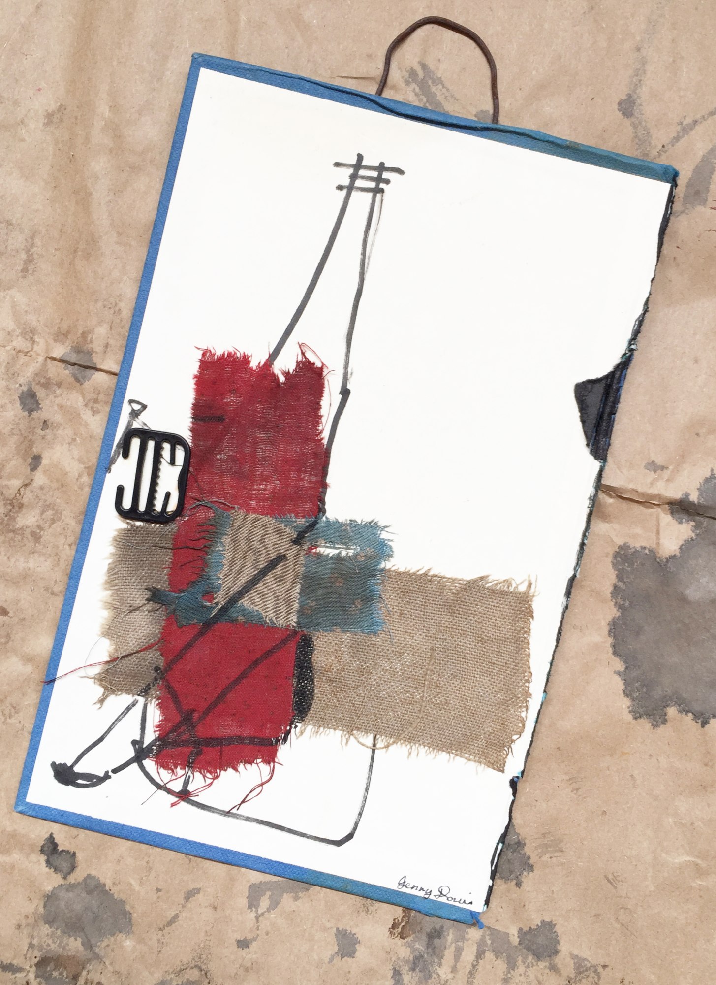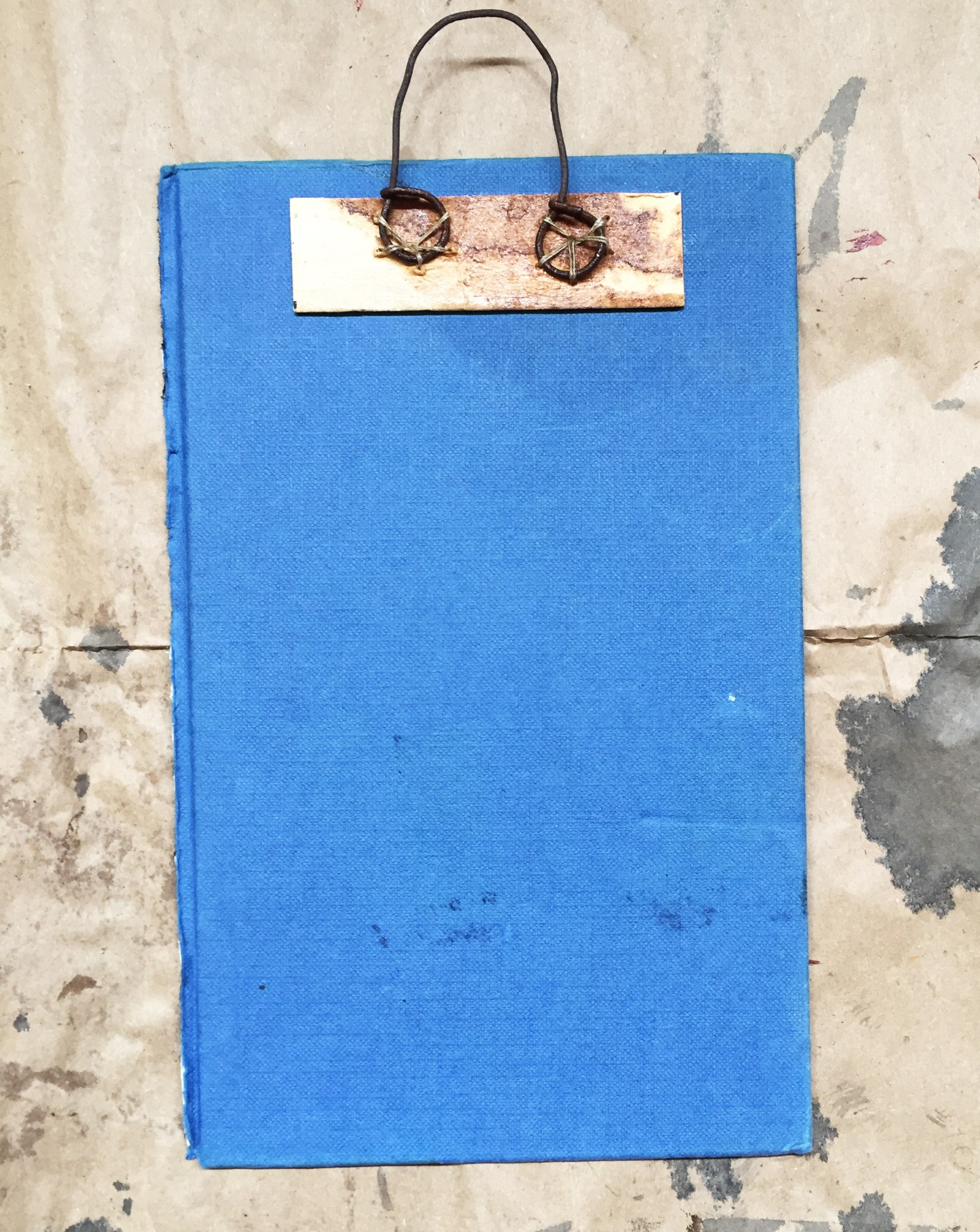 MED. Antique textiles 1800's, textile pen, vintage buckle, rusted wire hanger on vintage book cover. All sealed for protection.