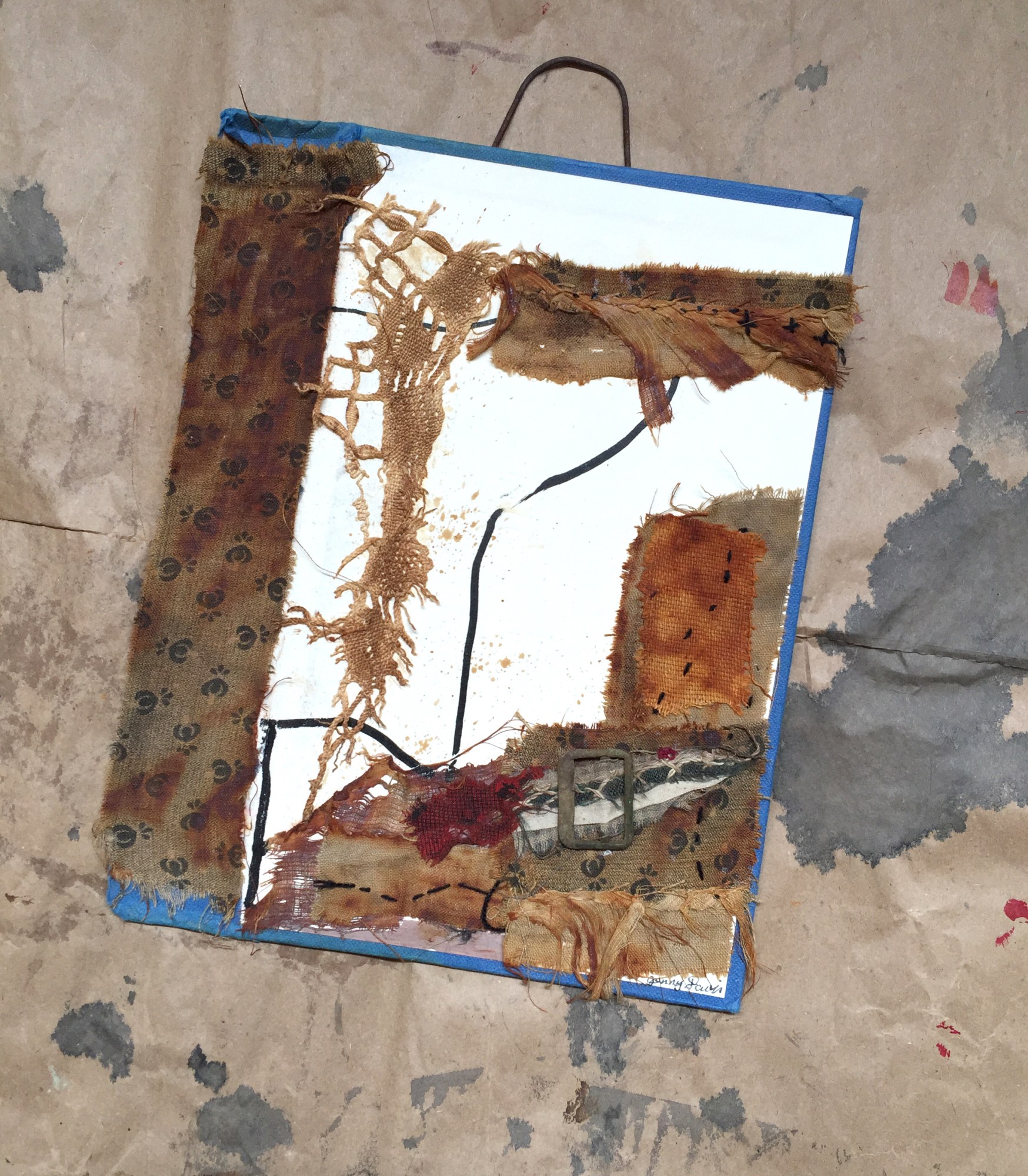 Med. Vintage book cover, 1800's antique textiles, vintage buckle, textile pen, thread and sealer on vintage linen card, book cover.