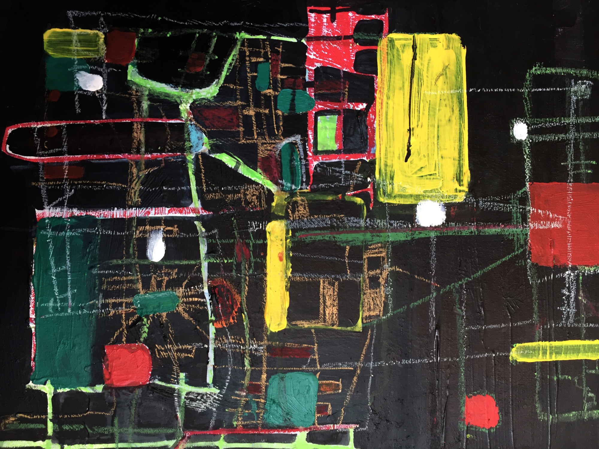 Constructions of layered line, grids, color and images beneath the Metro in Asnieres and Paris.