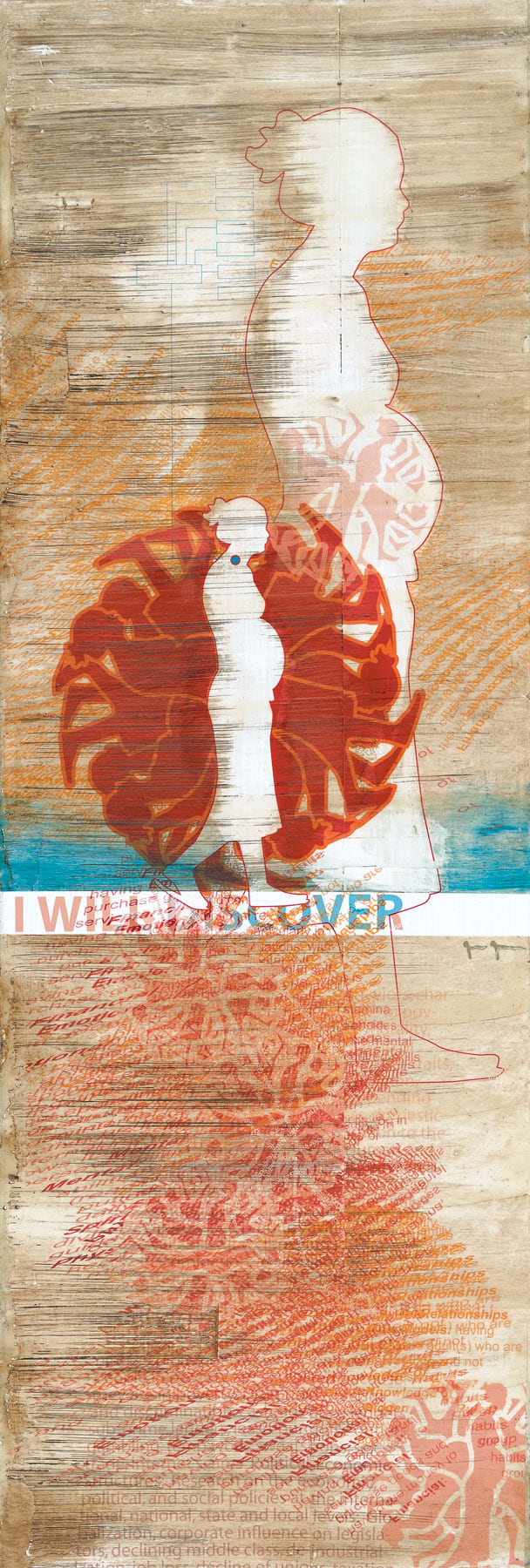 The surface is coated with a malleable wax texture, symbolizing both preservation and transformation. Distressed collage elements serve as visual metaphors—representing barriers, erosion, and the evolving layers of self-understanding.