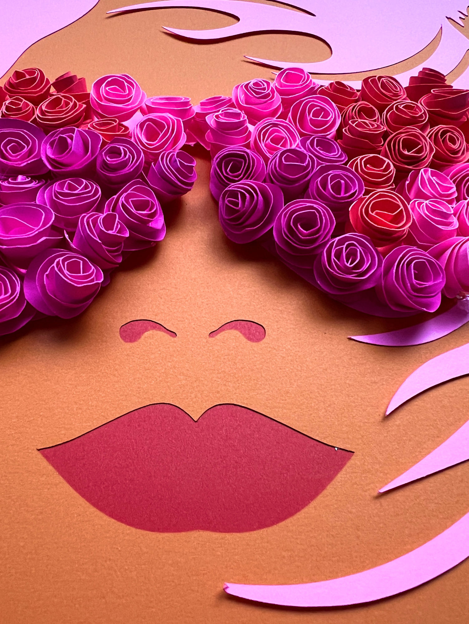 In Bloom — 12 × 12 inches. A layered paper composition featuring hand-rolled paper roses, exploring form, repetition, and care through hand-crafted detail. Original 1-1
