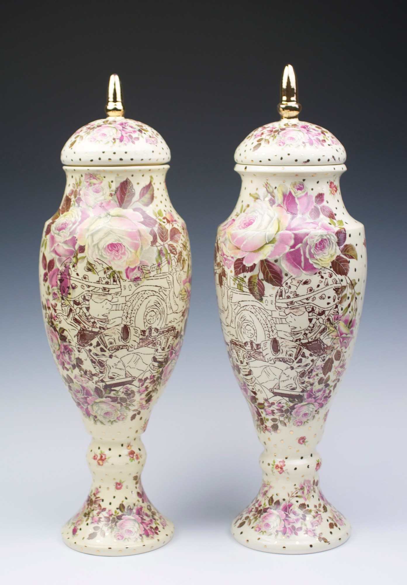 Earthenware, ^05, Thrown and Assembled in multiple sections, body, foot, lid and bullet finial, slip covered, laser decal from artist original drawing, commercial vintage rose decals, gold luster, multiple firings, 2015