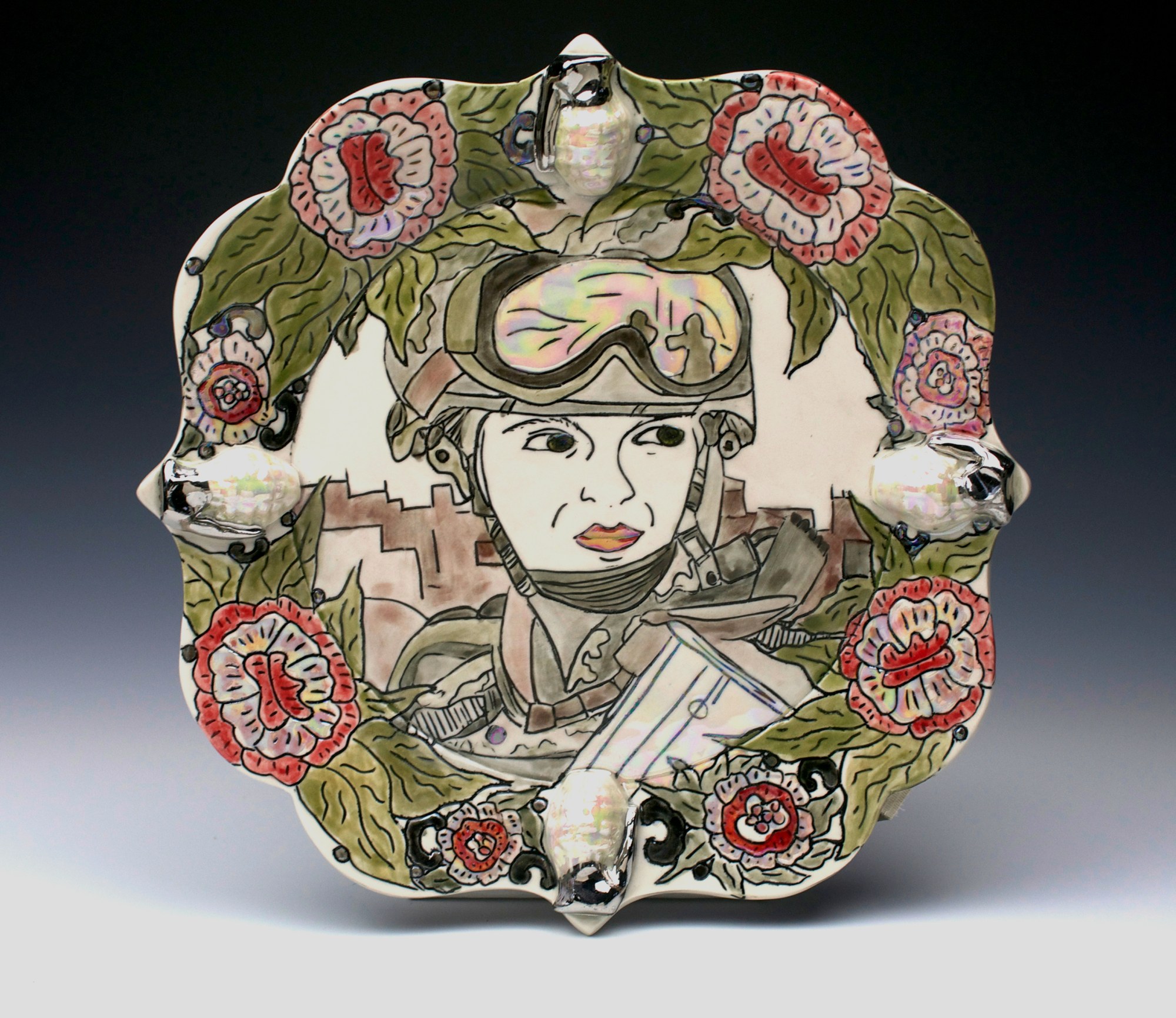 Slab Built and Pressed Porcelain Plate with Sprig Mold Grenades, Mishima inlay of Black Underglaze, Layers of Red, Brown, Green, Yellow and Black Underglaze with a Clear Gloss Glaze, Fired to Cone 6. Platinum and Mother of Pearl Lusters added and fired to cone 018