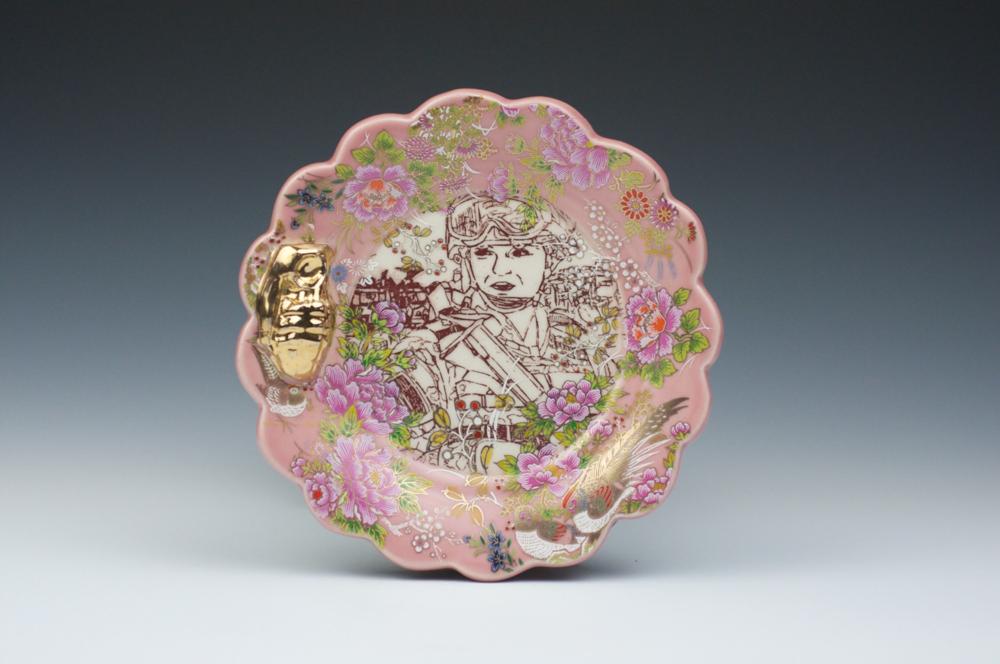 Porcelain Plate, slab built, sprig molded grenade, yellow glaze, ^6, original laser decal, collage border of vintage commercial decals, Gold luster.