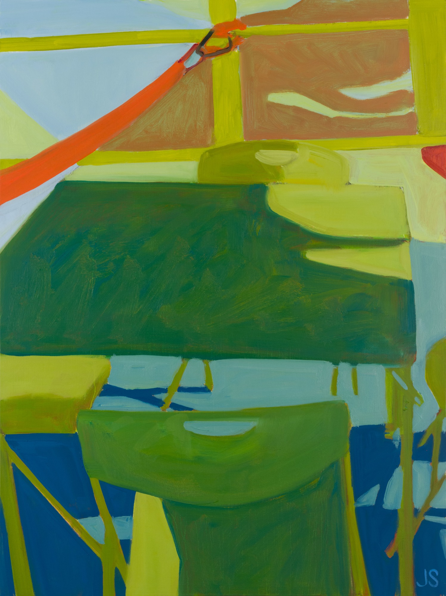 The morning of June 1st I made drawings of a table and chairs in our screened-in porch, a nod to some Richard Diebenkorn paintings of a single chair in an interior. Later that day in the studio, I decided to make a painting using one of those drawings as a reference. This painting was quiet and contemplative. I made another painting and another, all evocative of human presence, and each one a play of color and geometry and composition. In these paintings, through the careful arrangement of shapes and color, I envision creating space for conversations – hopefully the kind of exchanges that bring real profound understanding. Is this too much to want for my work? Maybe, but making art is in itself a hopeful act, and so it helps me feel optimistic.