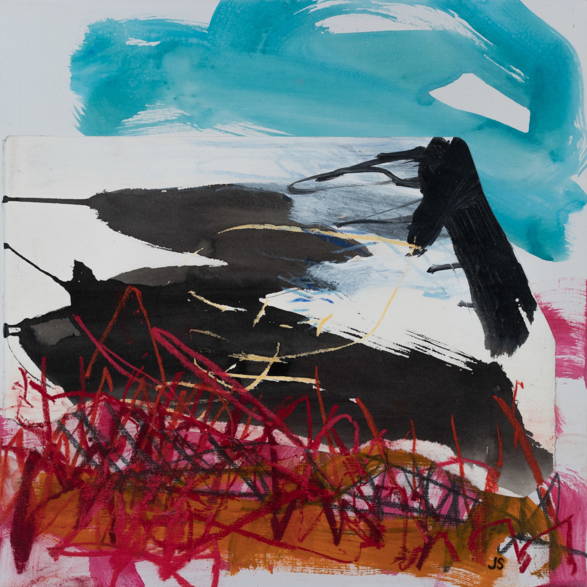 mixed media collage on panel: acrylic, pastel, graphite, ink, paper
