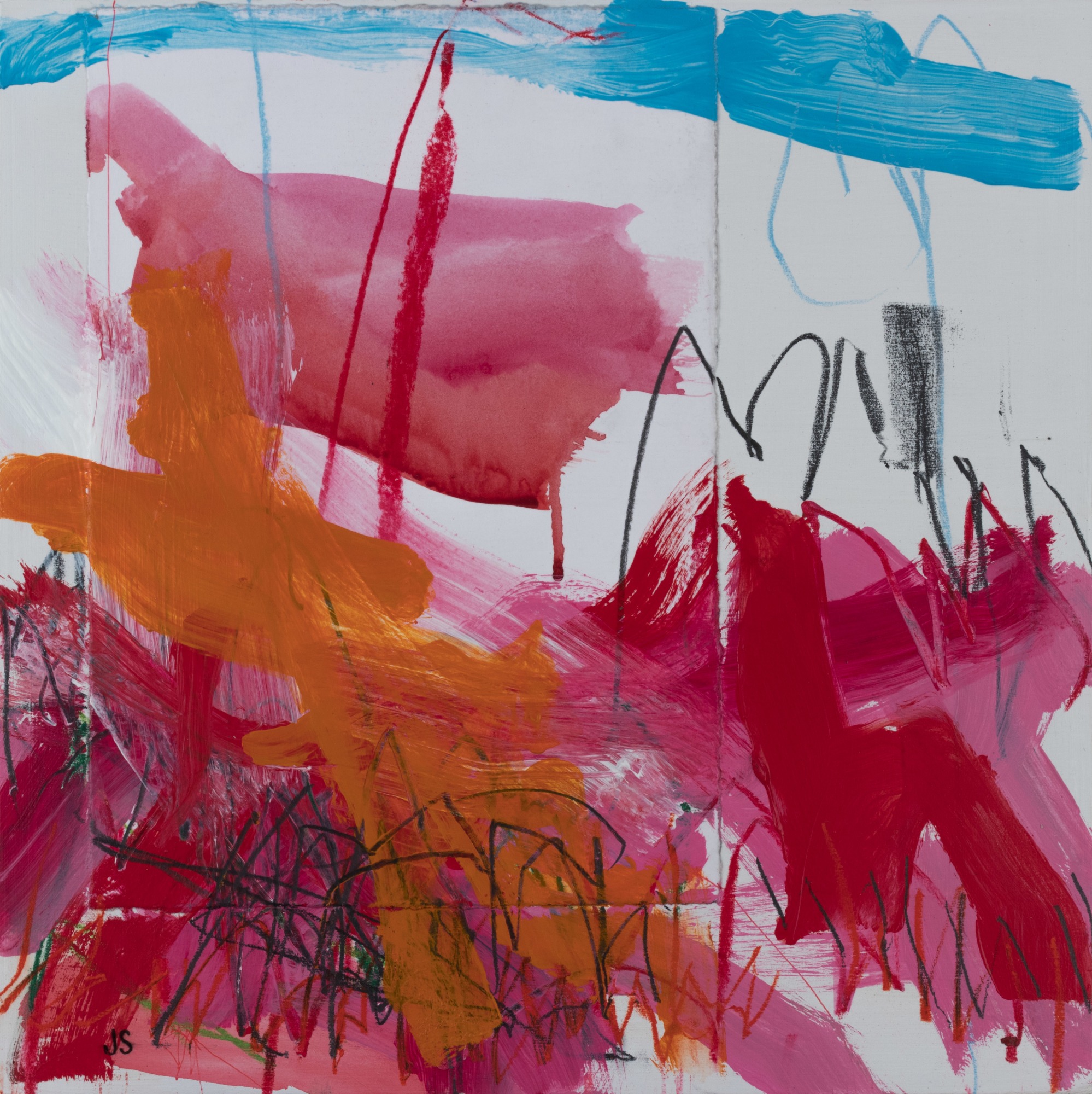 This is an original mixed media painting, signed on the front and hand labeled on the back by the artist. It features a range of materials: paper collage, acrylic, watercolor, pastel, ink, and graphite on a hardwood panel. The panel is made of basswood and is braced with a basswood cradle. This type of painting support has been valued since the 14th century for its strength and smooth surface.