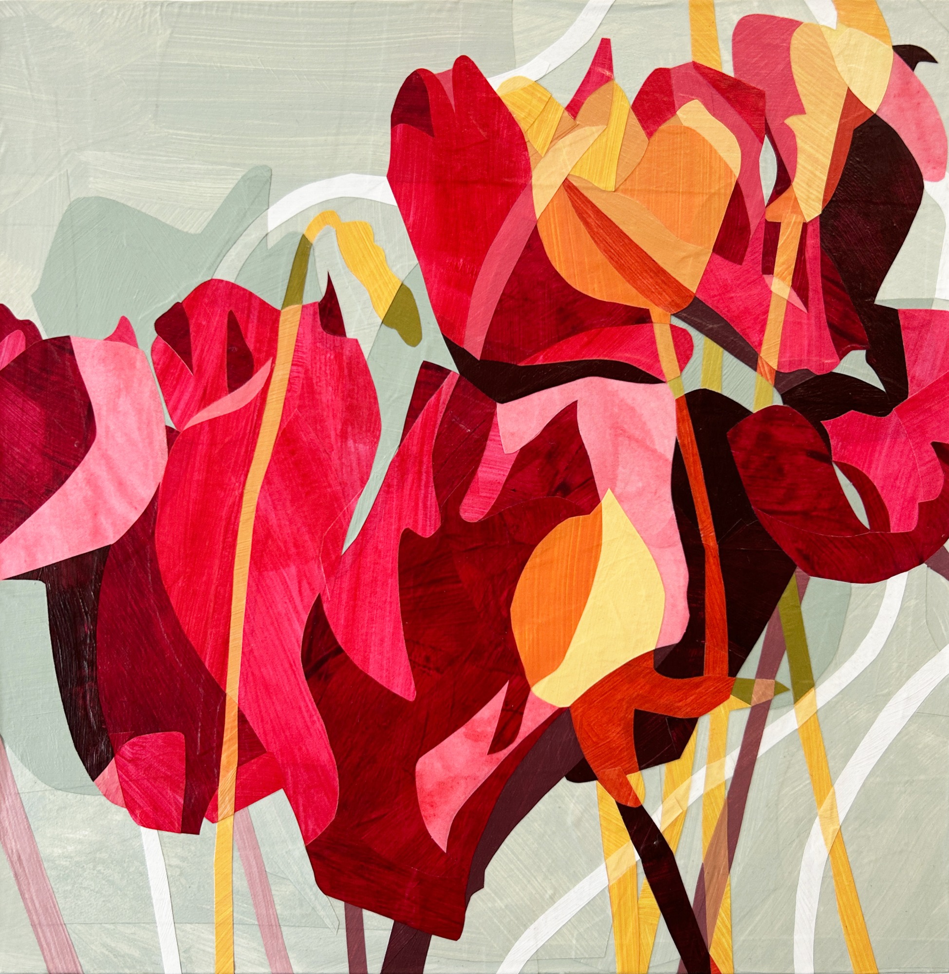 bright red and orange blossoms against a pale blue-green background with yellow floral silhouettes and white lines