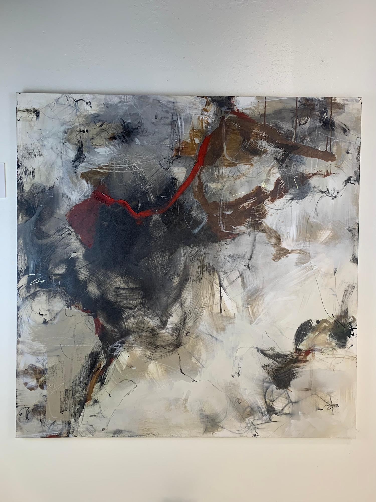 Creating expressive brushstrokes and mark-making while listening to and dancing along to Sabrina Carpenter’s song “Espresso.” A limited palette used of black, white, beige and sienna reds.