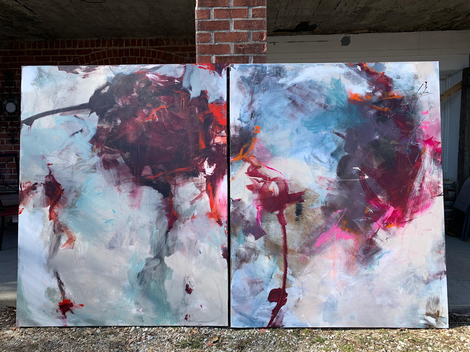 An unexpected diptych, not realizing until I put the two beside each other to store between layers. It took my breath away. It reminds me of looking up through the branches of the magnolia trees in bloom. A work in progress, to bring the colors together. Each piece is 60x48x1.5” The price reflects both pieces.