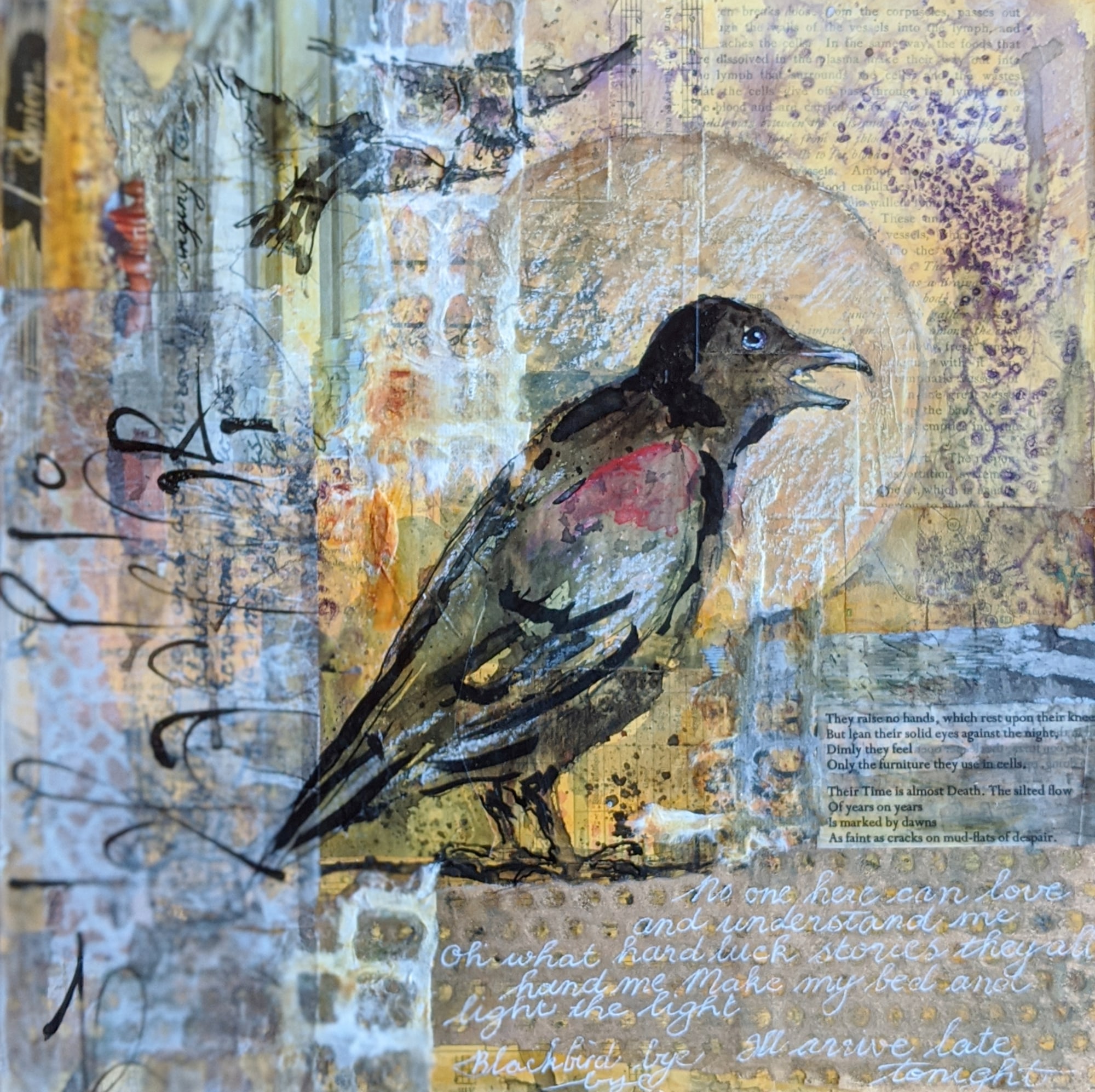 The inspiration for this was the song Blackbird by Paul McCartney. There is text from the lyrics incorporated into the overall surface texture. Paper, calligraphy, pen and ink, stains, muslin and more comprise the design which is on a deep cradle wood board.