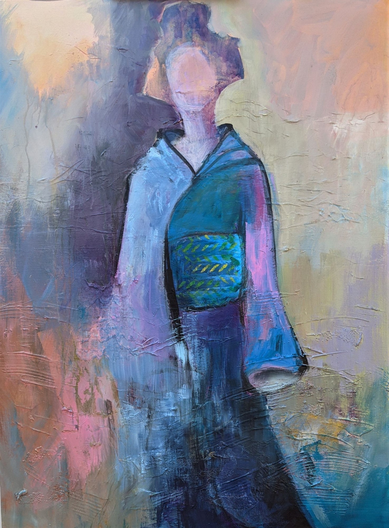 This painting evokes a romantic feeling of grace, beauty and calm. The figure, which is faceless, fades in and out of the loosely painted background. Not having a recognizable identity, she represents the spirit of mysterious Far Eastern feminine beauty. It is a painting that will grow on the viewer the more it is seen. There is always more to see in it. The application of paint is masterful in its fluidity and rendering of depth.