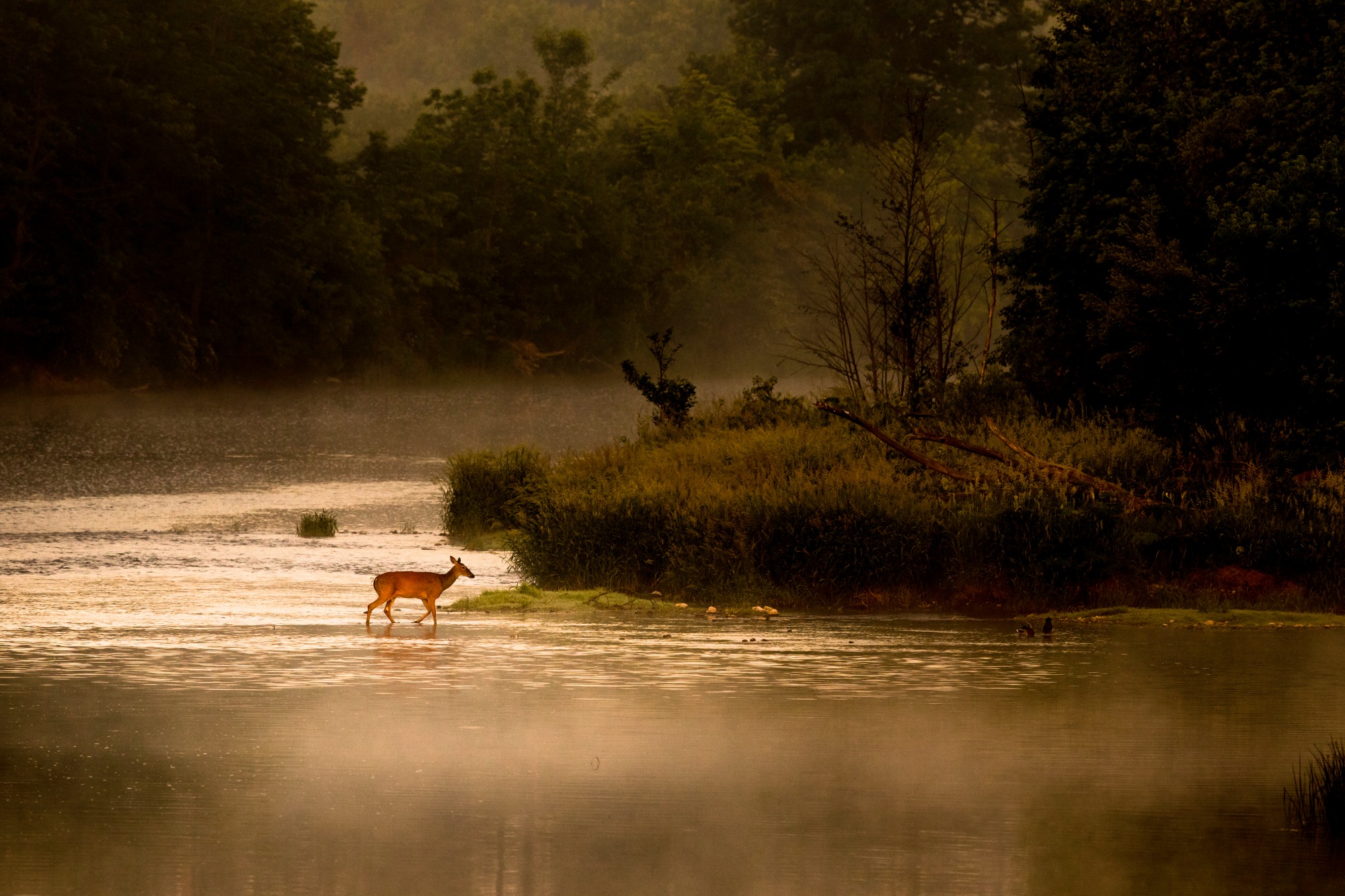Image taken at first light. Whitetail deer crossing the Nith river.