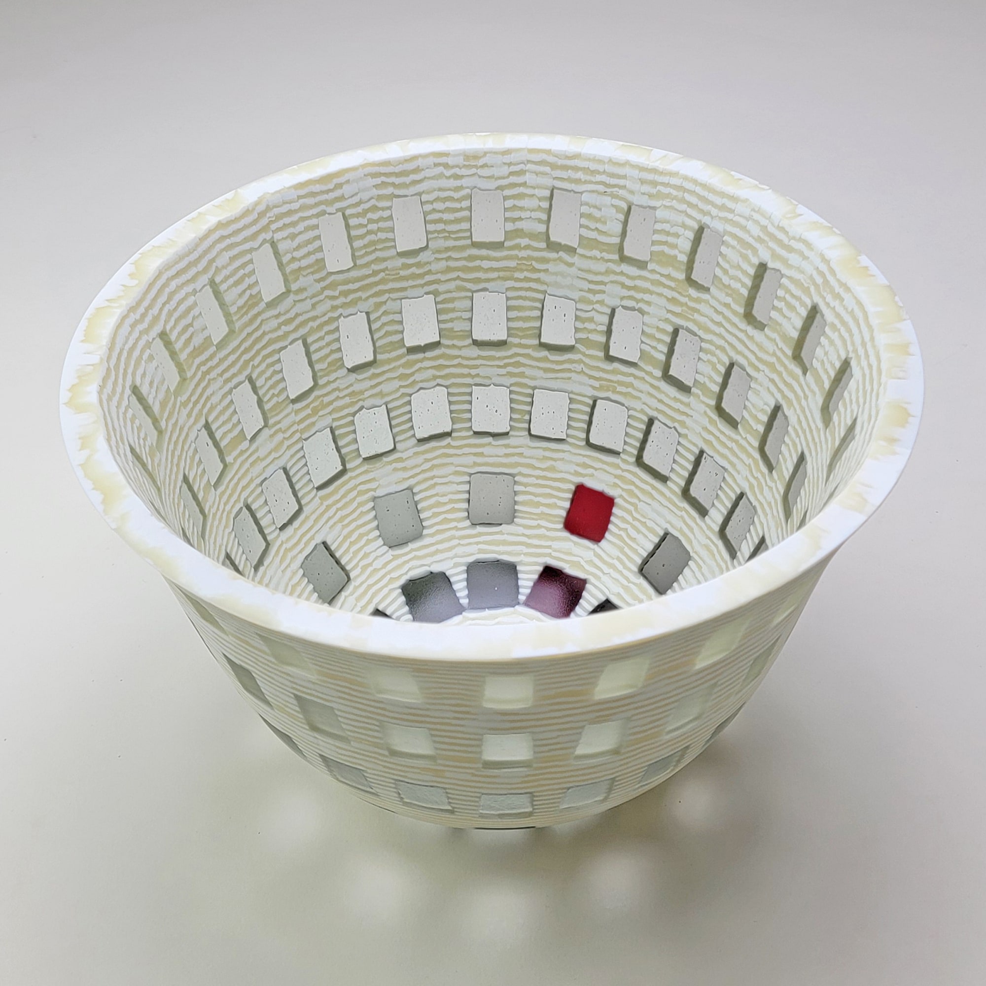 The vessel’s restrained palette reinforces its clarity, emphasizing subtle shifts in value rather than bold color. The interplay of gray tones in the transparent squares creates a delicate gradient, transitioning from lighter to darker as they descend toward the base. This controlled variation enhances the vessel’s depth and dimensionality, reinforcing its strong architectural presence. A singular red inlay near the bottom introduces just enough contrast to add intrigue without disrupting the overall harmony.